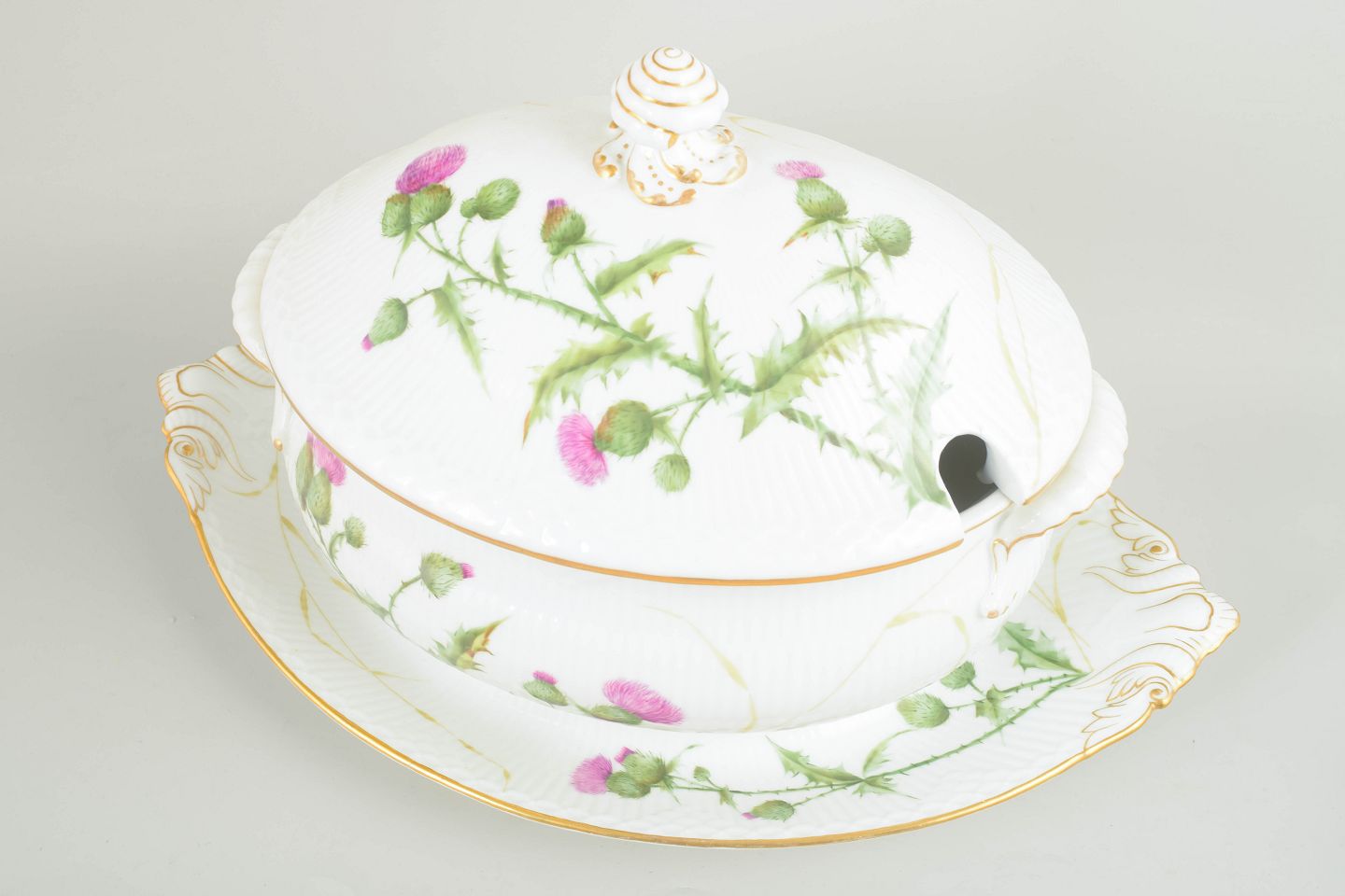 Royal Copenhagen, antique large soup tureen with stand.Large hand-painted porcelain soup tureen with matching stand, decorated with a naturalistic thistle motif and refined gilded details. Executed to a very high standard of craftsmanship, characteristic of Royal Copenhagen’s prestigious serving pieces of the 19th century.