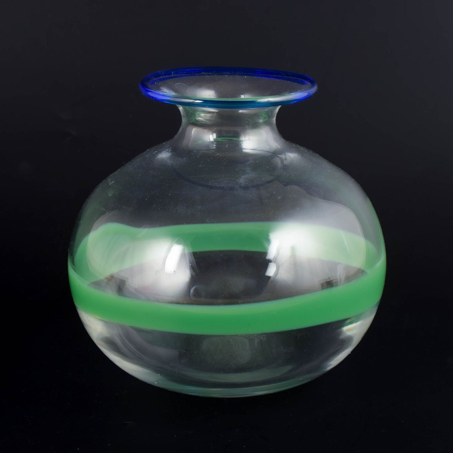 Blown art glass vase in clear glass with a broad green horizontal band and a blue accented rim. Model 42237.