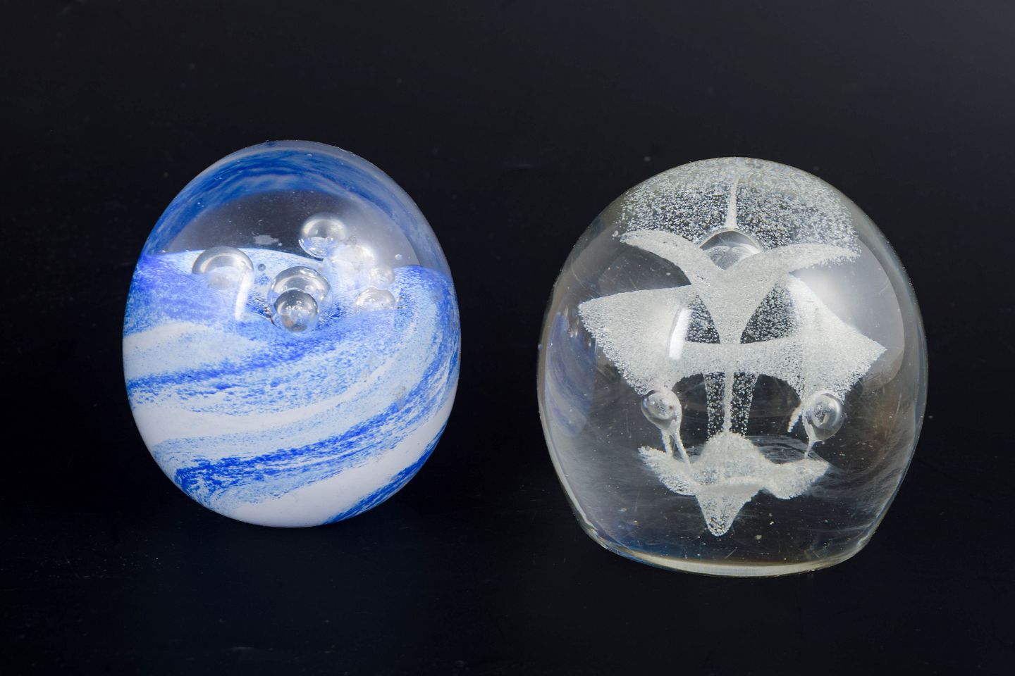 Åhus and others, paperweights.Organically shaped paperweight in clear art glass with internal blue and white veils and encapsulated air bubbles. Signed to the base “Studio Åhus, NK 1915–1990”.