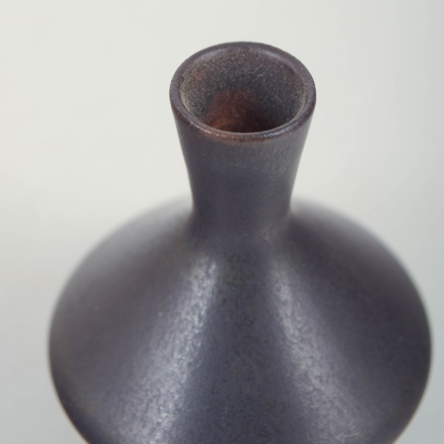 Miniature stoneware vase with a matte dark violet-grey glaze, pronounced body and a narrow, elongated neck.