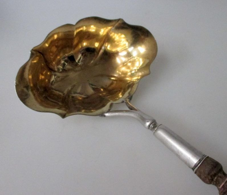 Silver baroque punch spoon, 18th century. Denmark. Crooked rococo. Inside gilded. Indistinctly stamped. With wooden handle. Length: 43.5 cm. With engraving: N. Th. S - CHS 1804 - remains of previous engravings.