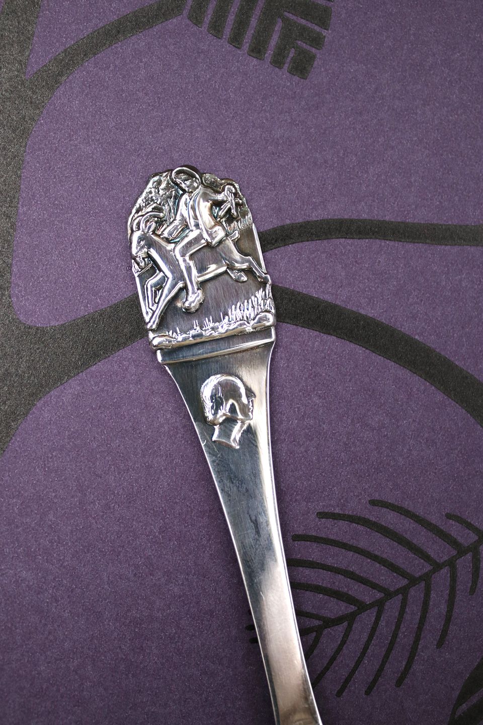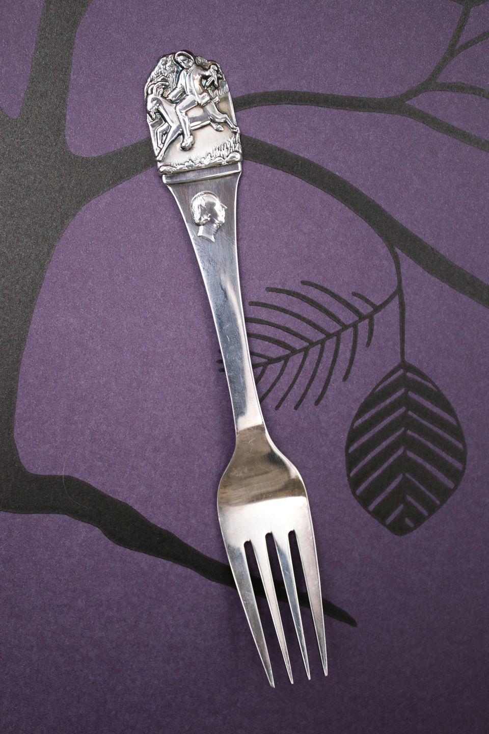 Children's fork in silver (stamped) with children's motifs on the handle from the H. C. Andersen fairy tale "Clumsy Hans".Length: 16cm. Weight: 32.9 grams.