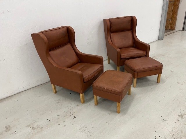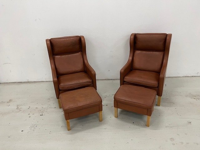 Mogens Hansen MH195 wingback chairs with matching footstoolsCognac-colored semi-aniline leather and oak legs.Original new price: DKK 62,606.-The chairs are in very good condition and have only been used sparingly. They come from a smoke- and pet-free home.The set can also be purchased individually including footstool.Price per set (chair and footstool): DKK 17,000.-Exclusive, high wingback chairs in a classic and timeless design by Mogens Hansen. The chairs are fitted with down-filled seat inserts, which ensures optimal comfort and an elegant and inviting expression. A chair that combines aesthetics and functionality and adds both style and comfort in a special class to the interior.The matching footstools are made of the same exclusive materials and design line. With down-top upholstery, high seating comfort is achieved, and the stools are a natural and harmonious complement Dealer