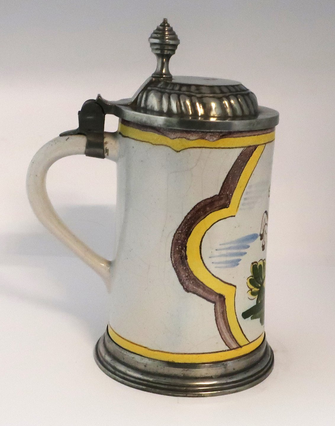 Kellinghusen. Earthenware mug with pewter lid. Decorated with a jumping horse. Height 23 cm Dealer