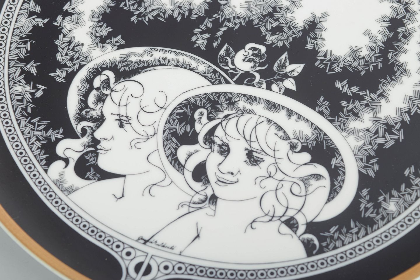 Hollóháza, large dish.Large round dish in white glazed porcelain with black decorative border and figural motif on the lid. Produced by the Hollóháza Porcelain Manufactory.