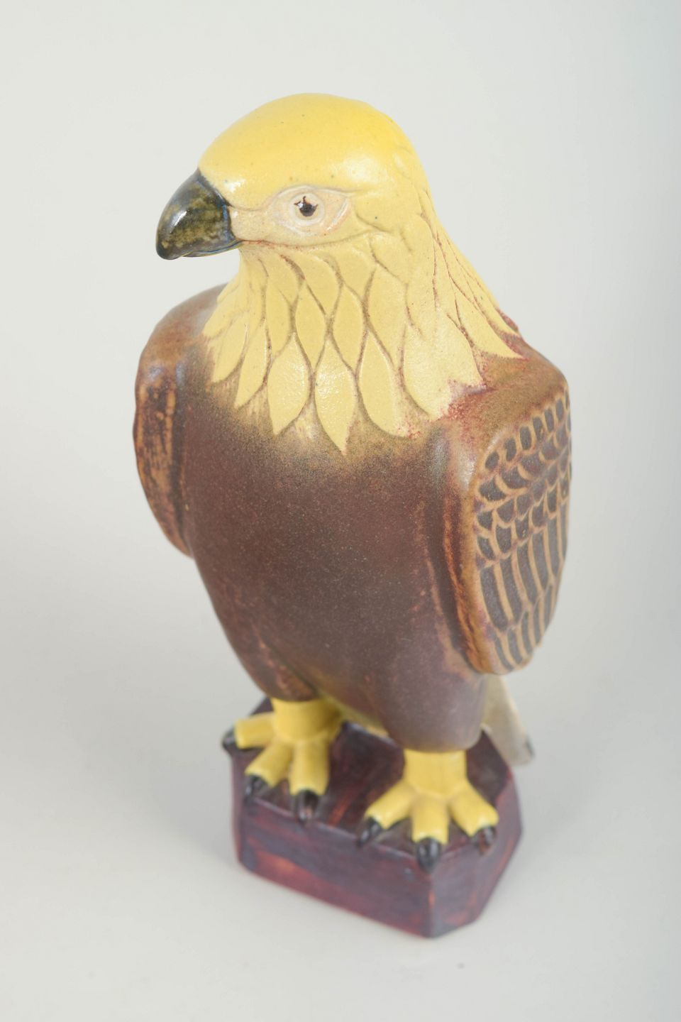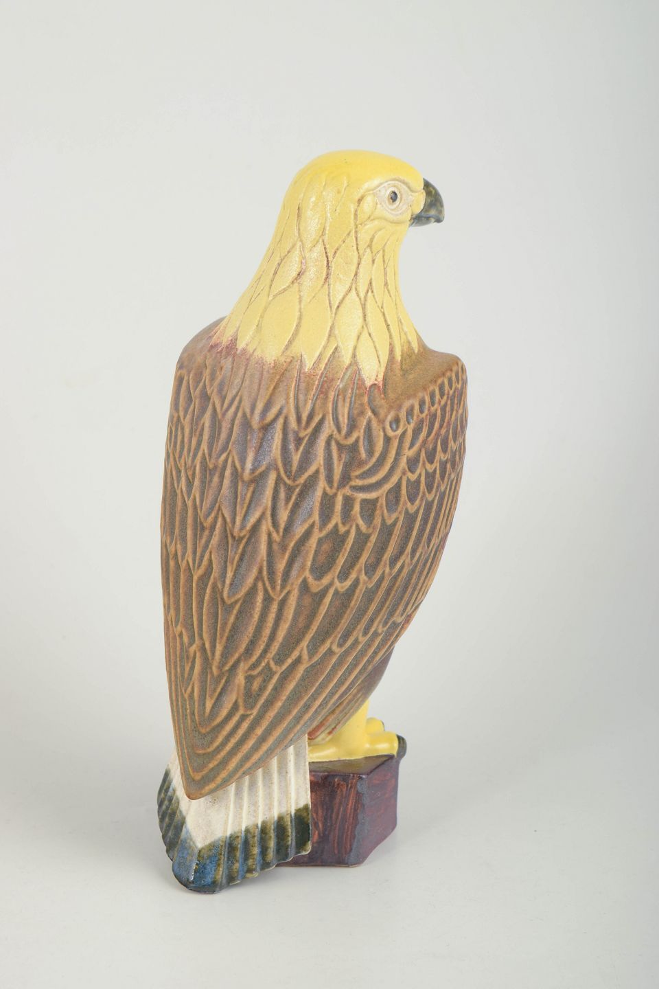 Ego Stengods, falcon figure.Naturalistically modelled falcon in glazed stoneware with a brown body, yellow head and breast, and detailed decoration on the wings. The figure stands on a square base and is stamped EGO Stengods, Lidköping, Sweden together with the model number on the underside.