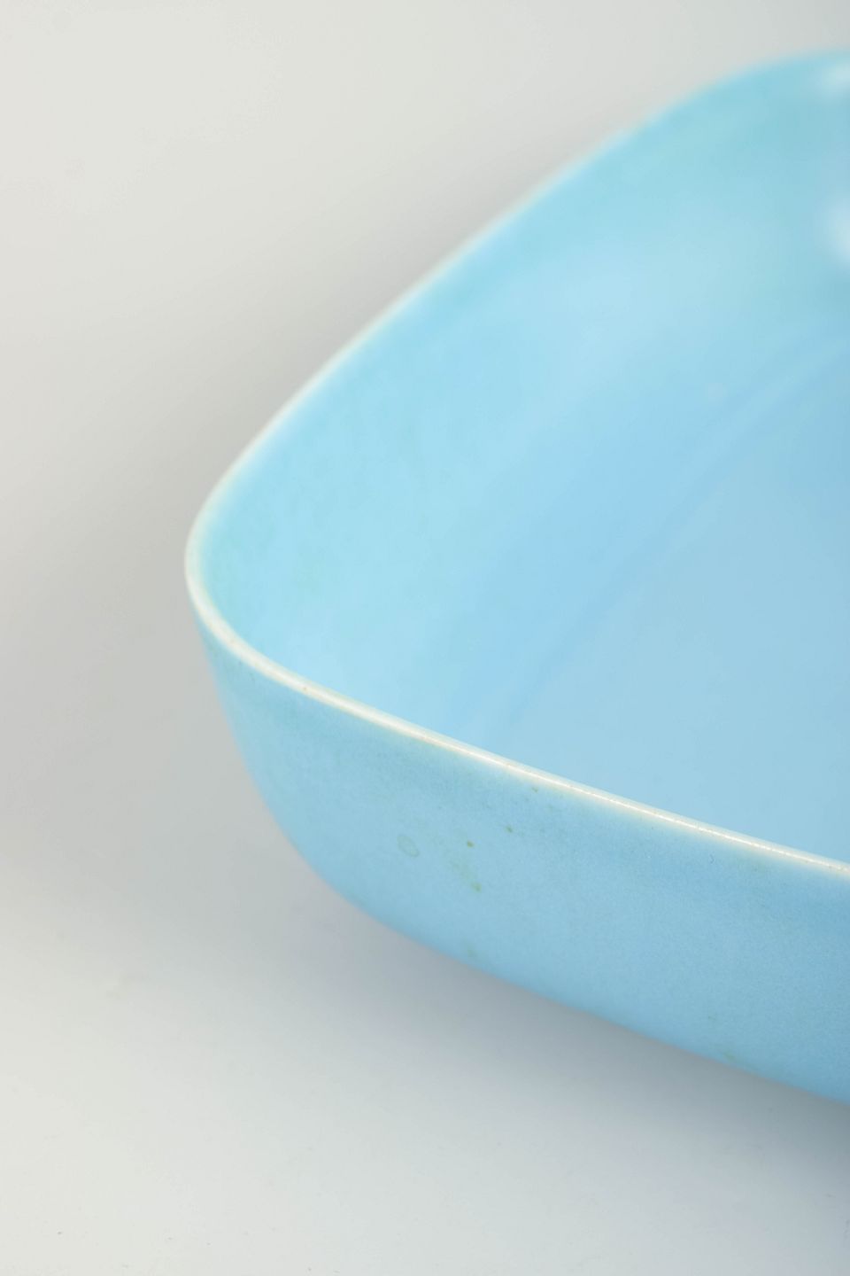 Höganäs Keramik, large bowl in turquoise glaze.Square bowl in stoneware with rounded corners and an even turquoise glaze.
