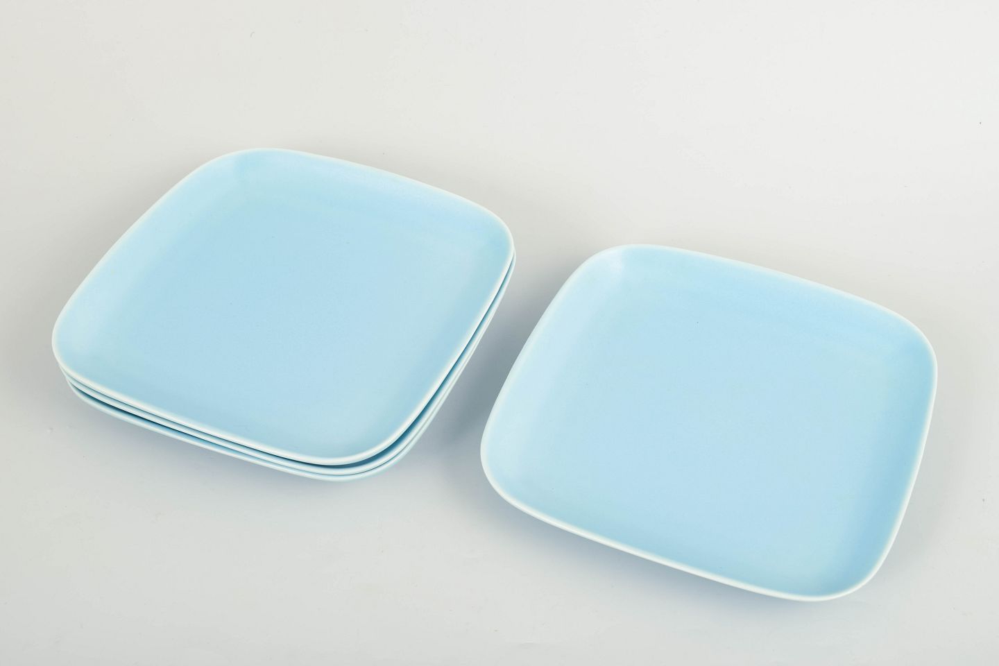 Höganäs Keramik, set of four dinner plates in turquoise glaze.Square dinner plates in stoneware with rounded corners and an even turquoise glaze.