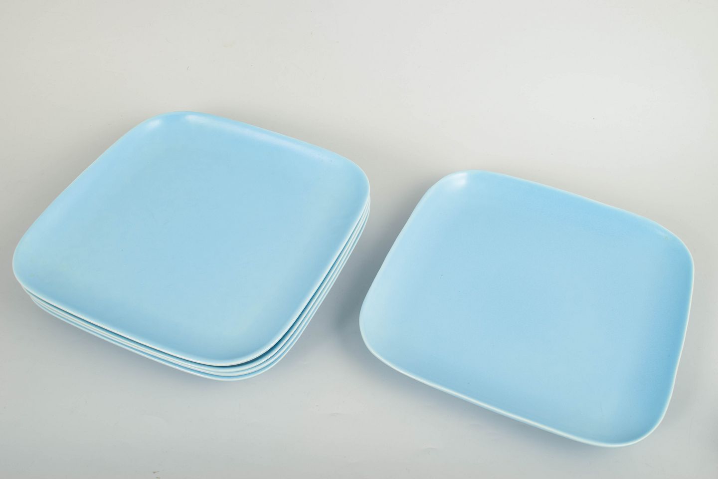 Höganäs Keramik, set of five dinner plates in turquoise glaze.Square dinner plates in stoneware with rounded corners and an even turquoise glaze.