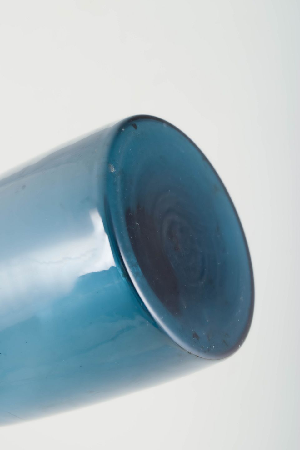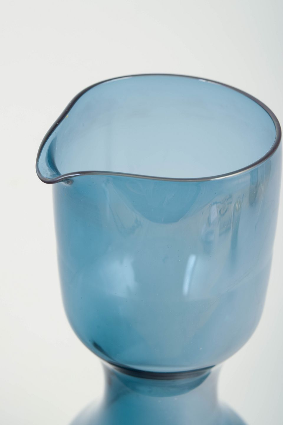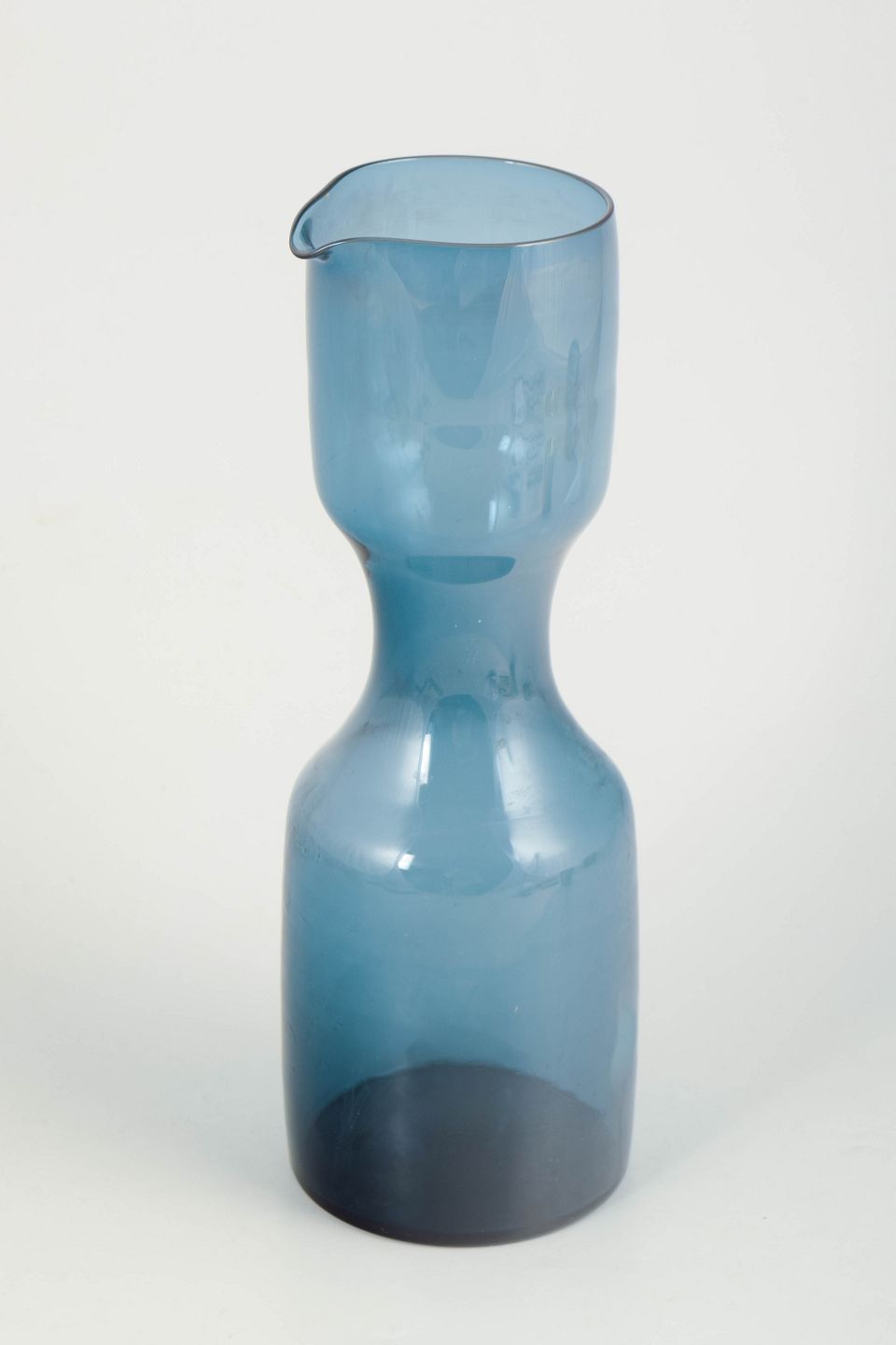Kjell Blomberg for Gullaskruf, pitcher.Slender hourglass-shaped pitcher in mouth-blown glass with a gently waisted neck and subtle pouring lip. Executed in transparent blue with a darker base section, characteristic of Swedish glass design of the 1960s.