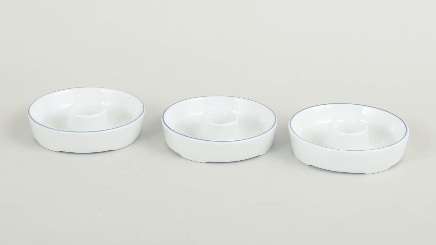 Grethe Meyer for Royal Copenhagen, set of three small Blue Line candlesticks.Three small round candlesticks in white glazed porcelain with a simple blue line along the rim. The design forms part of the Blue Line series and reflects the strict functionalist aesthetic of the 1970s. Unmarked.