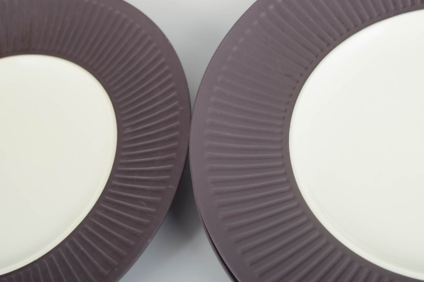 Jens Harald Quistgaard for Dansk Designs, set of 3 dinner plates.Set consisting of three stoneware dinner plates with white glaze and ribbed rim, featuring a light glazed centre.