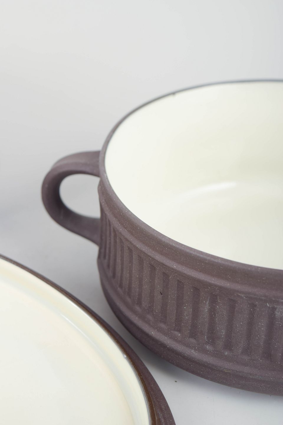 Jens Harald Quistgaard for Dansk Designs, set of 2 lidded bouillon cups.Two stoneware bouillon cups with lids and side handles, executed in a white glaze with ribbed decoration.