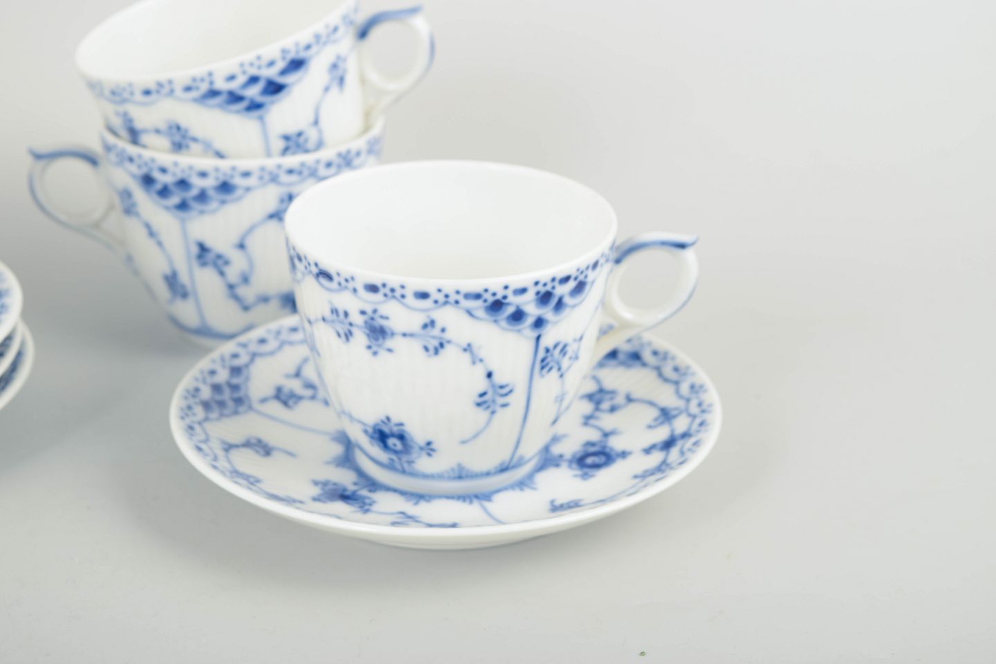 Royal Copenhagen was founded in 1775 in Copenhagen under royal charter. The factory is internationally recognised for its hand-painted porcelain and high artistic standards. Blue Fluted Half Lace is a variation of the classic Blue Fluted service, combining fluted surfaces with a decorative lace border executed with exceptional craftsmanship.