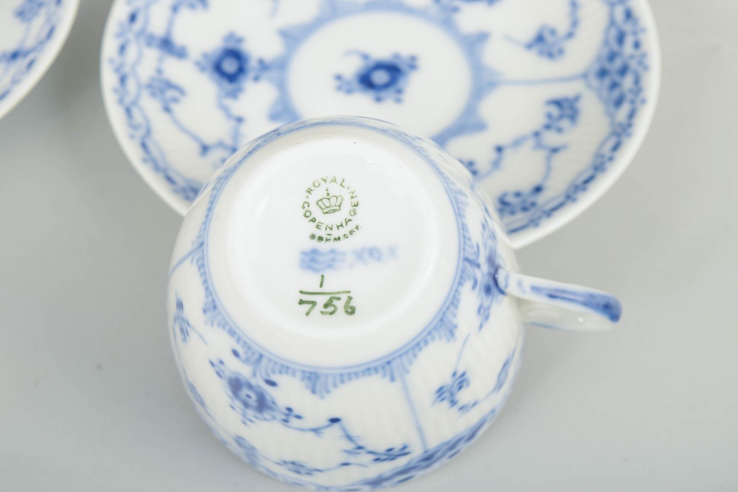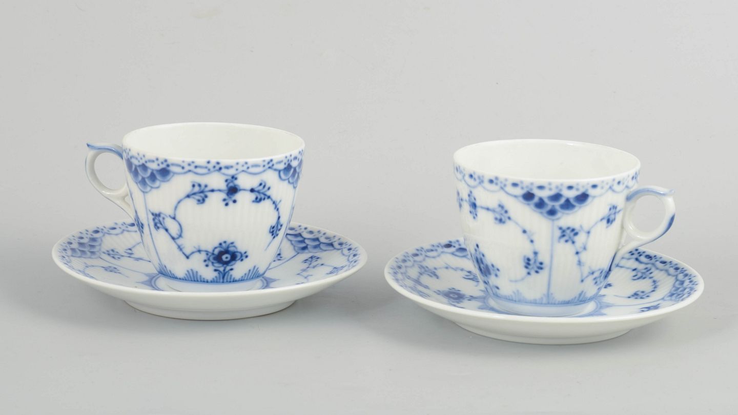 Royal Copenhagen was founded in 1775 in Copenhagen under royal charter. The factory is internationally recognised for its hand-painted porcelain and high artistic standards. Blue Fluted Half Lace is a variation of the classic Blue Fluted service, combining fluted surfaces with a decorative lace border executed with exceptional craftsmanship.