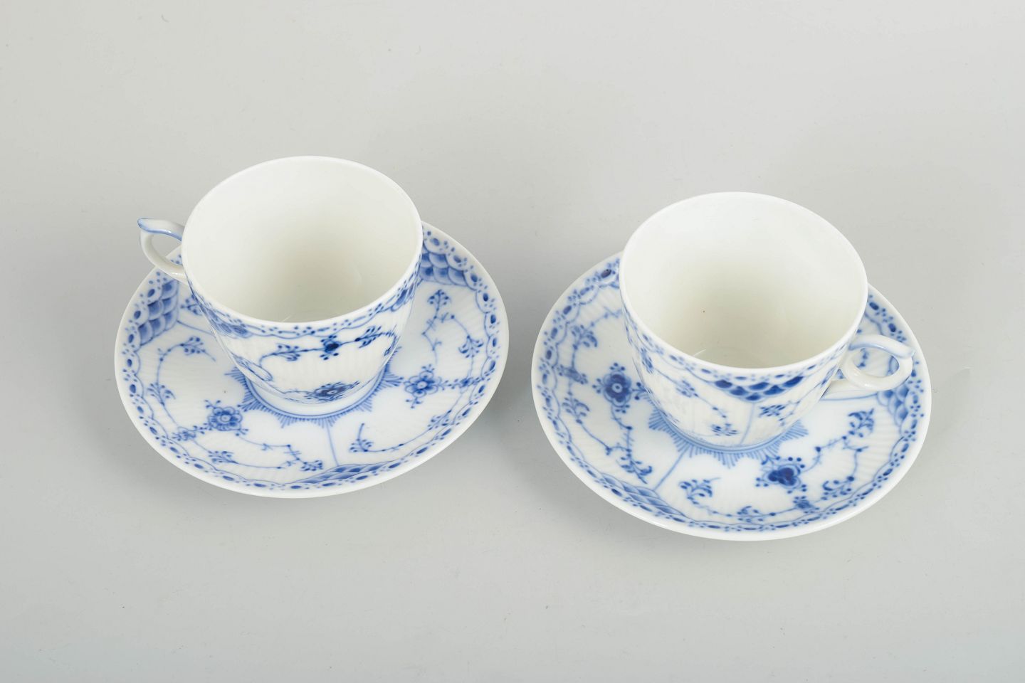 Royal Copenhagen Blue Fluted Half Lace, set of two coffee cups with matching saucers.Set of two coffee cups with matching saucers in hand-painted porcelain from the Blue Fluted Half Lace service with classic underglaze decoration in cobalt blue, fluted panels and characteristic lace border. Model 1/756. First factory quality. Produced in 1966.