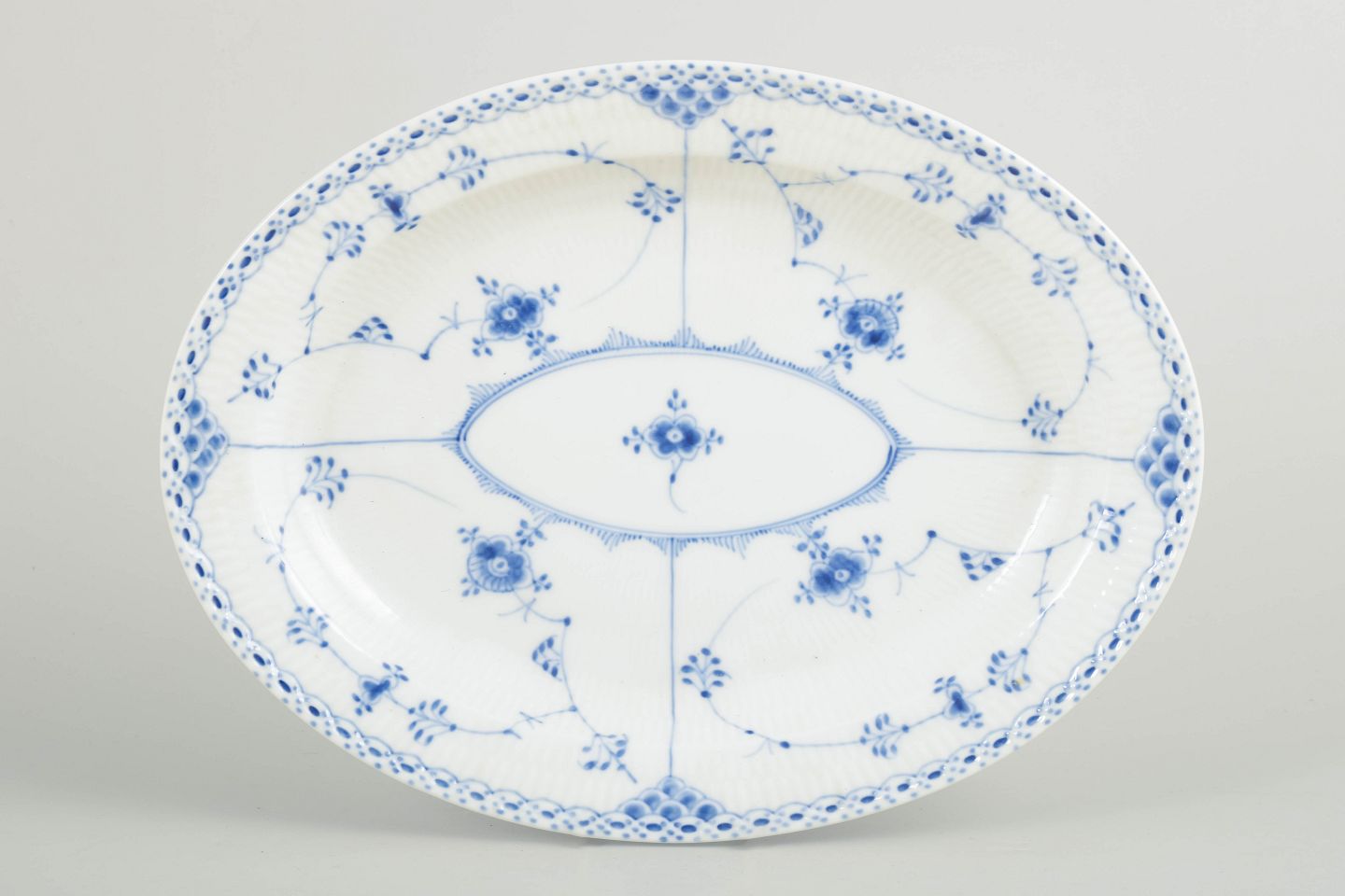 Royal Copenhagen Blue Fluted Half Lace, oval dish.Oval dish in hand-painted porcelain from the Blue Fluted Half Lace service with classic underglaze decoration in cobalt blue, fluted panels and characteristic lace border. Model 1/628. First factory quality. Produced in 1964.