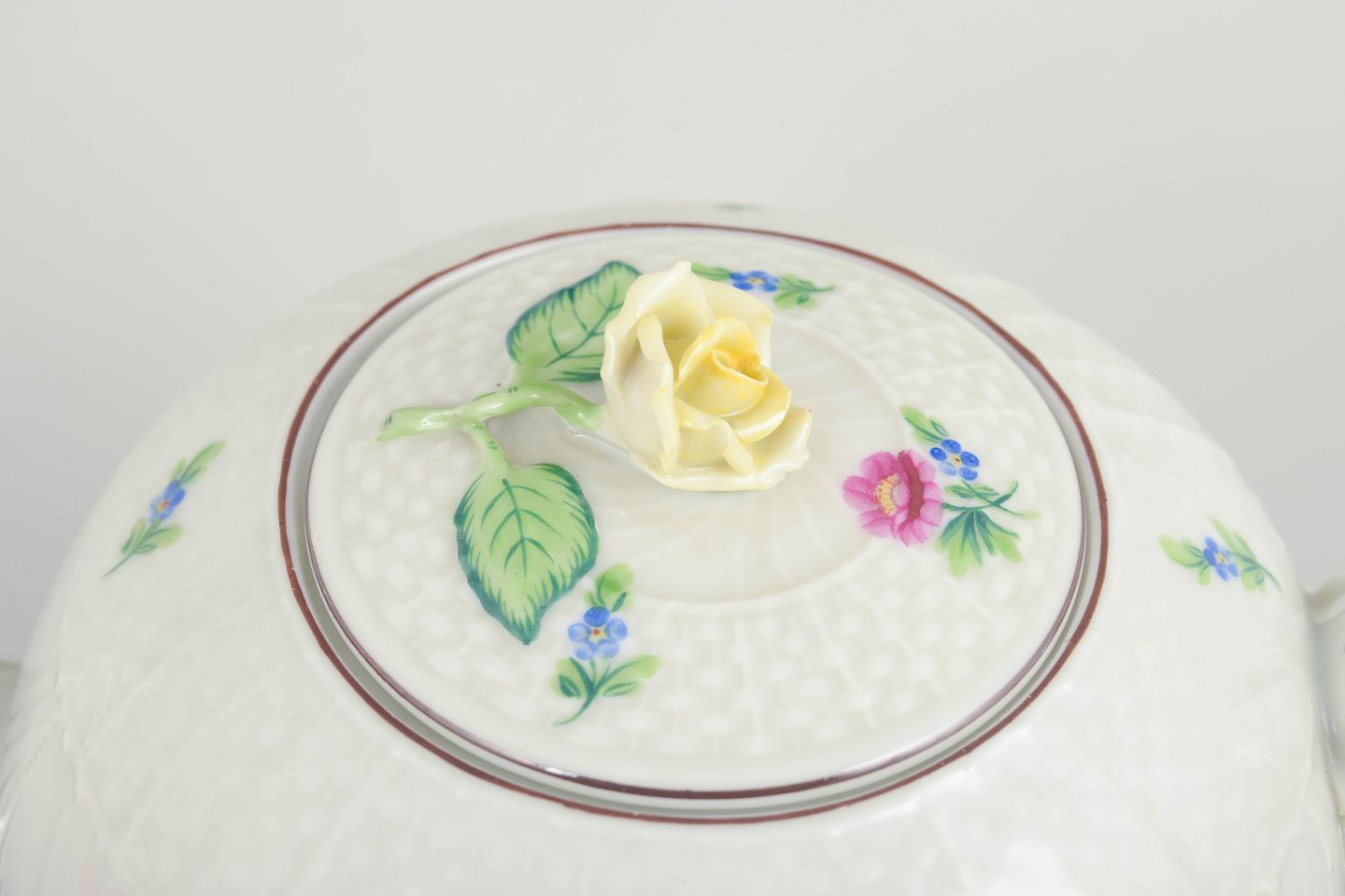 Teapot in hand-painted porcelain from Herend. Decorated with naturalistic flowers in pink and blue tones with delicate green leaves. The lid is finished with a knop shaped as a yellow rose. Factory mark in blue under the base.