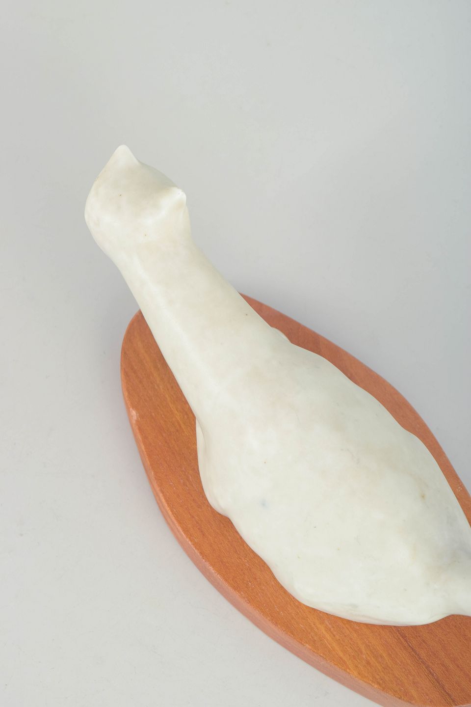 Lillemor Petersson for Rörstrand, cat figure on wooden stand.Naturalistically shaped cat in white stoneware with an elongated, stylised body and raised tail. The figure is standing on an oval wooden base and displays a restrained modernist design characteristic of Rörstrand’s mid-twentieth-century production. Factory mark cancelled with one incised line.