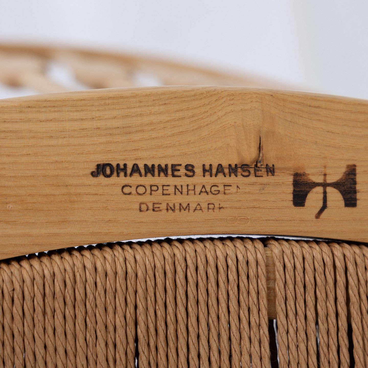 JH 550 - 'Peacock Chair' armchair in patinated ash with teak armrests and woven paper yarn seat. Branded by manufacturer.
