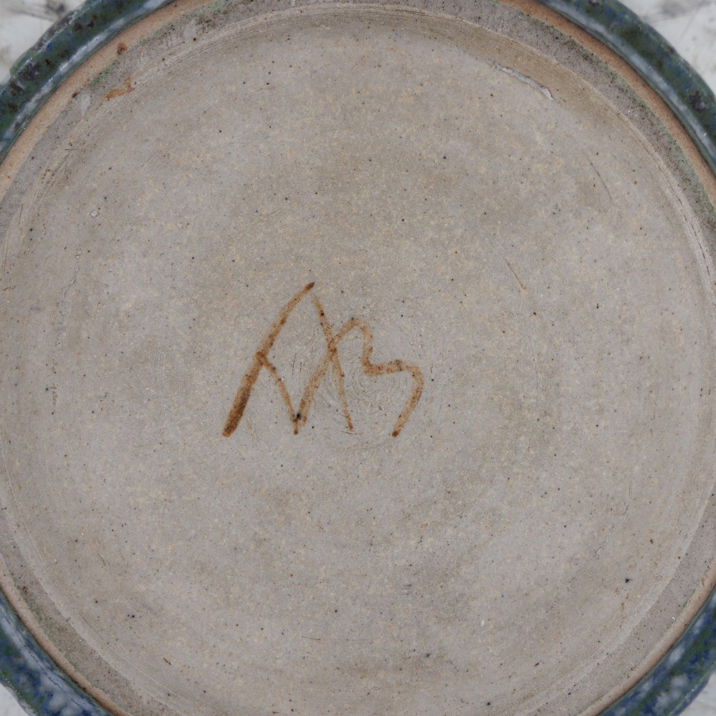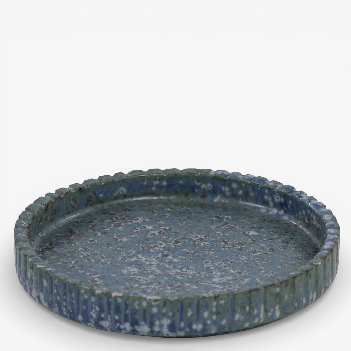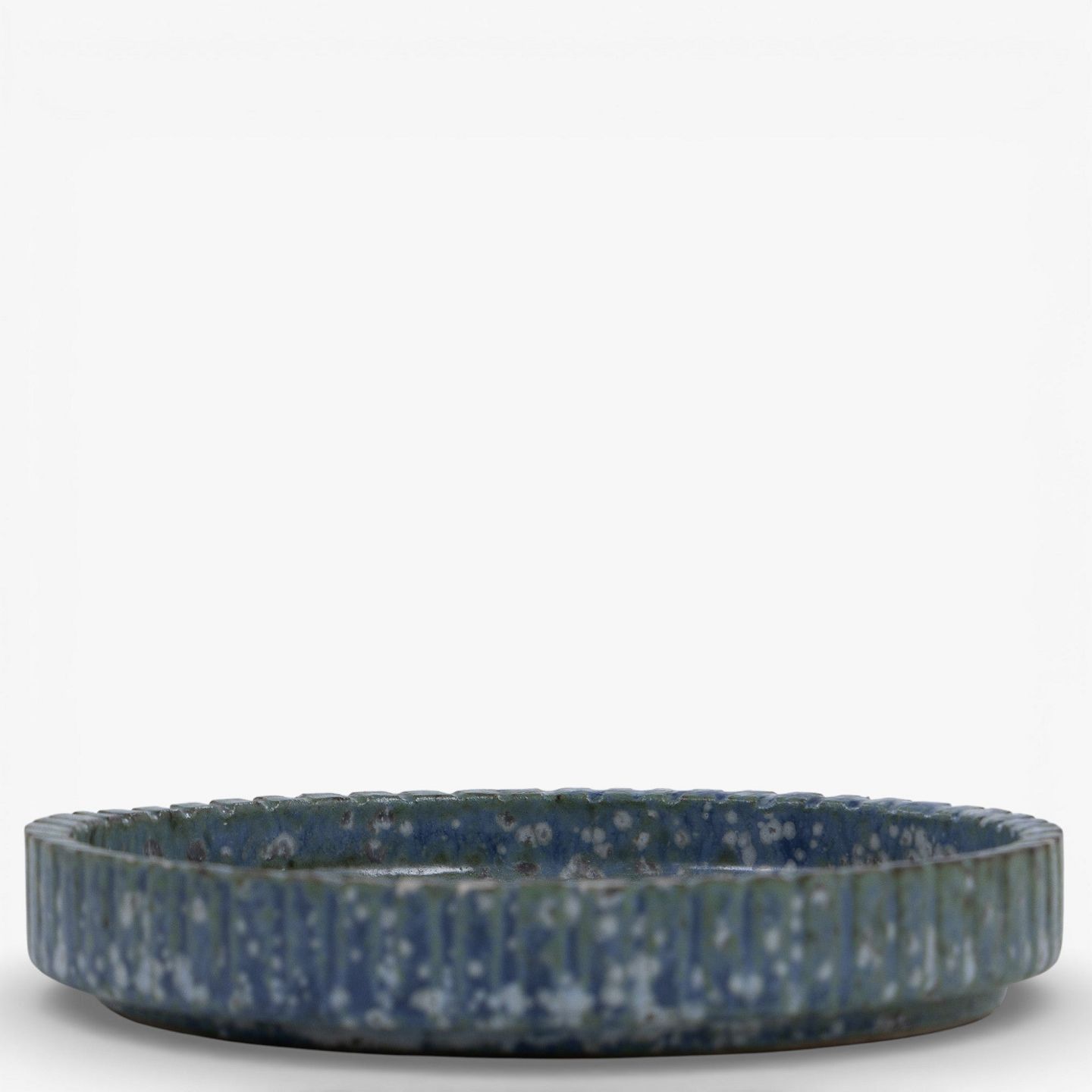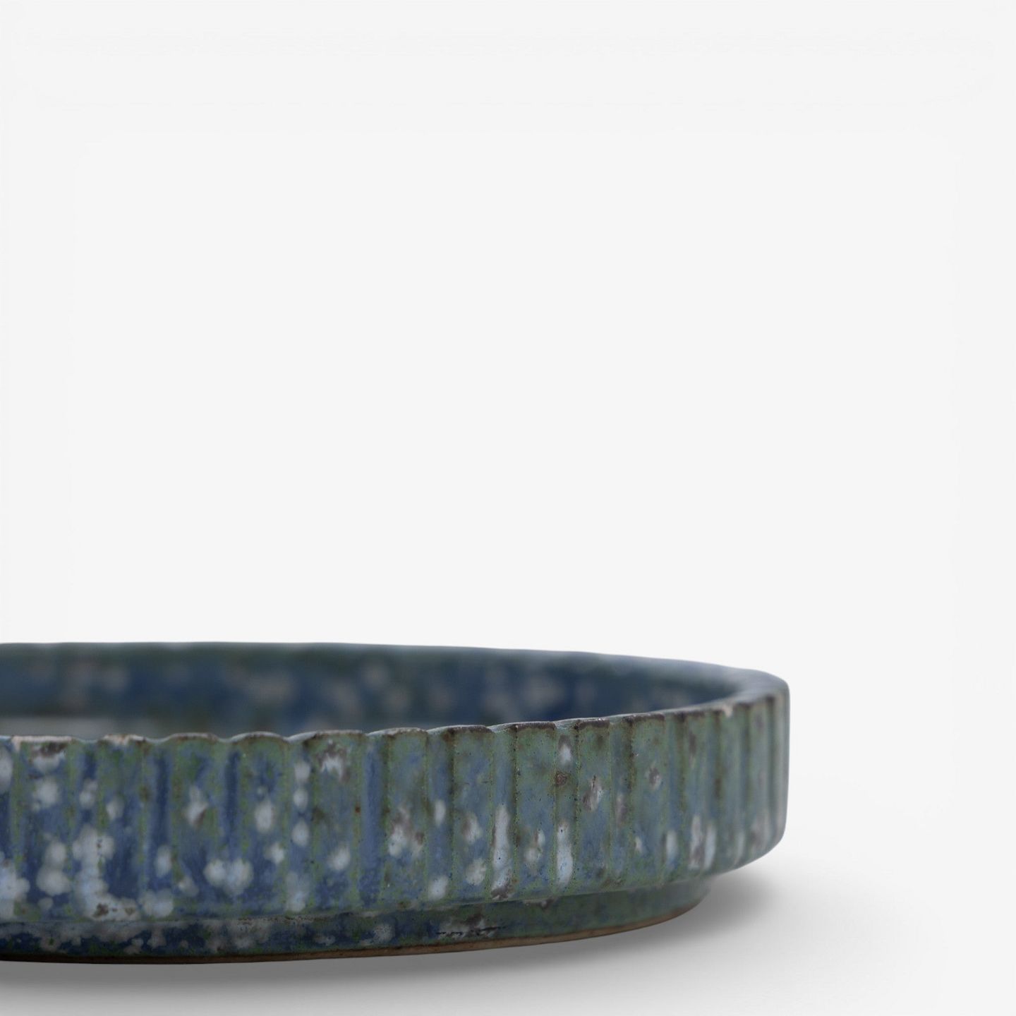Round dish in fluted stoneware with blue-green glaze. Signed.