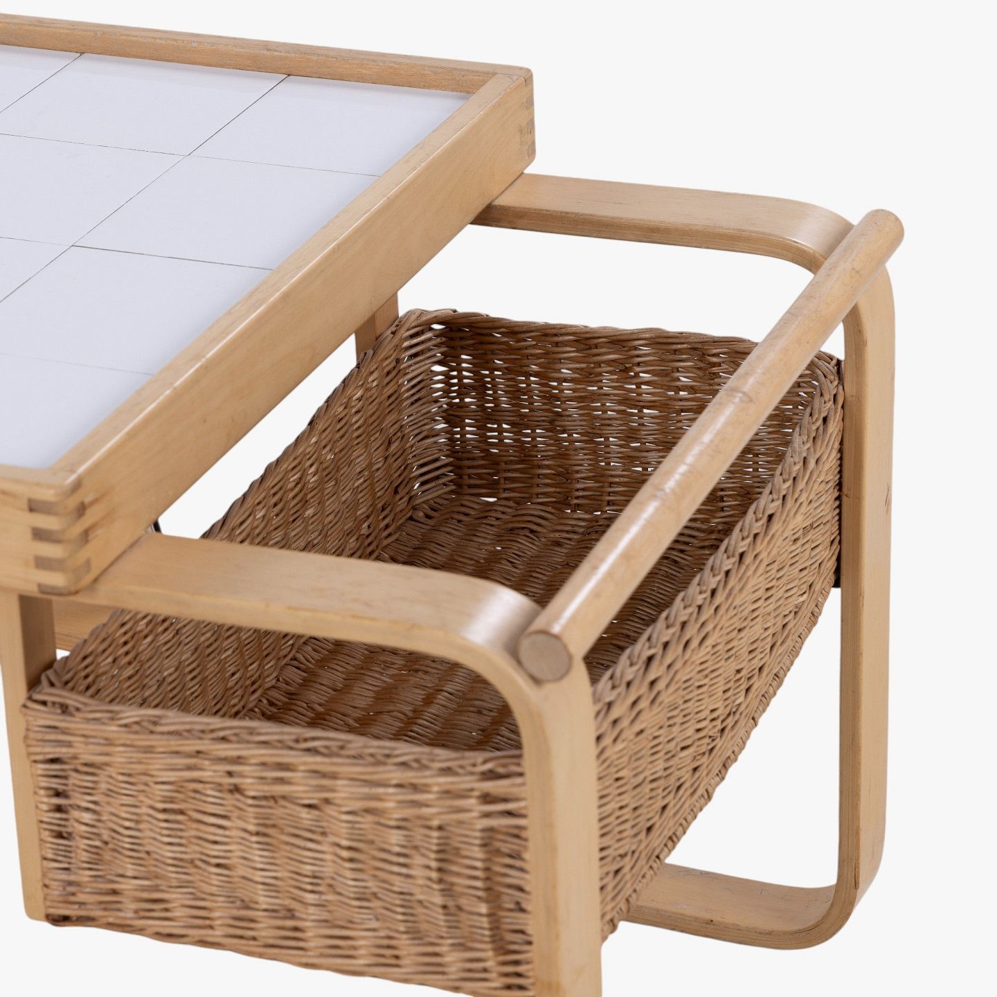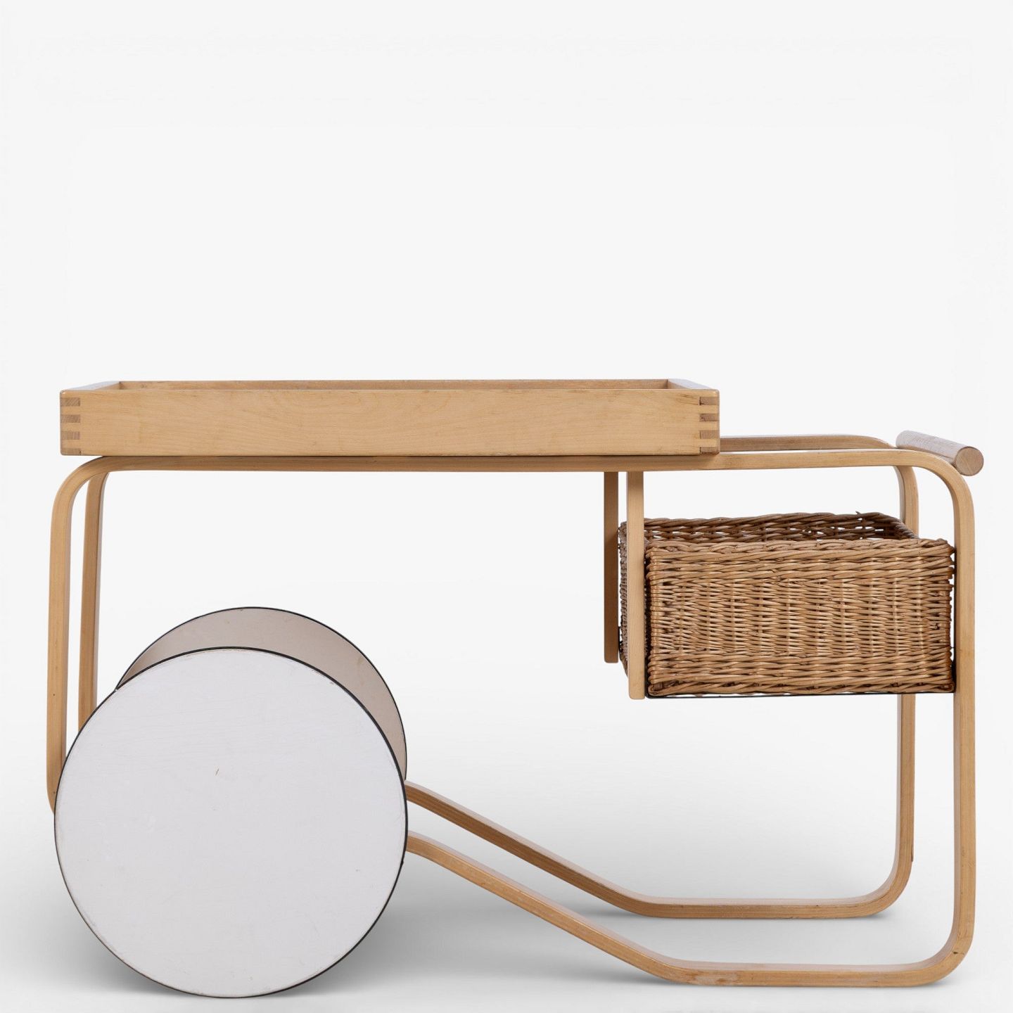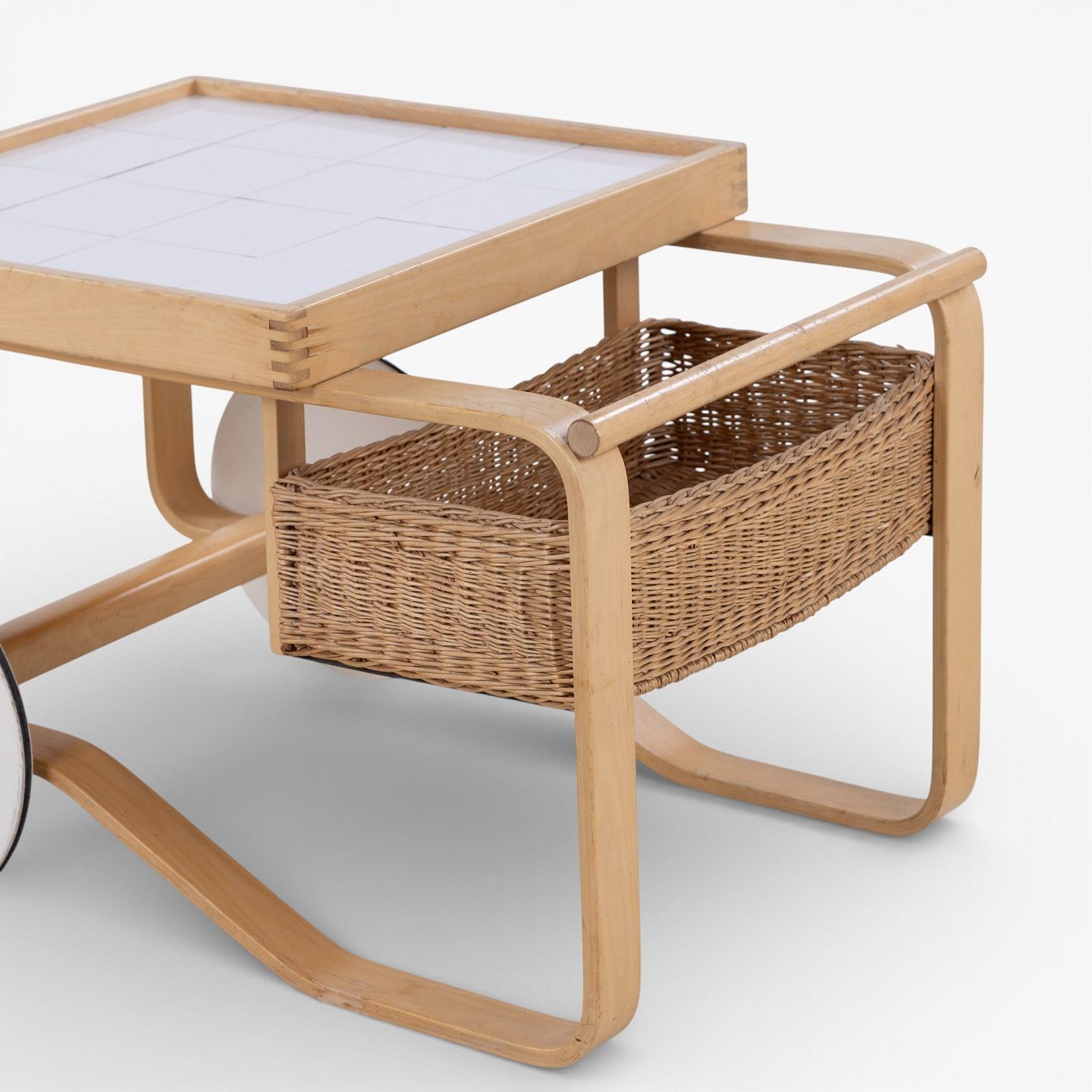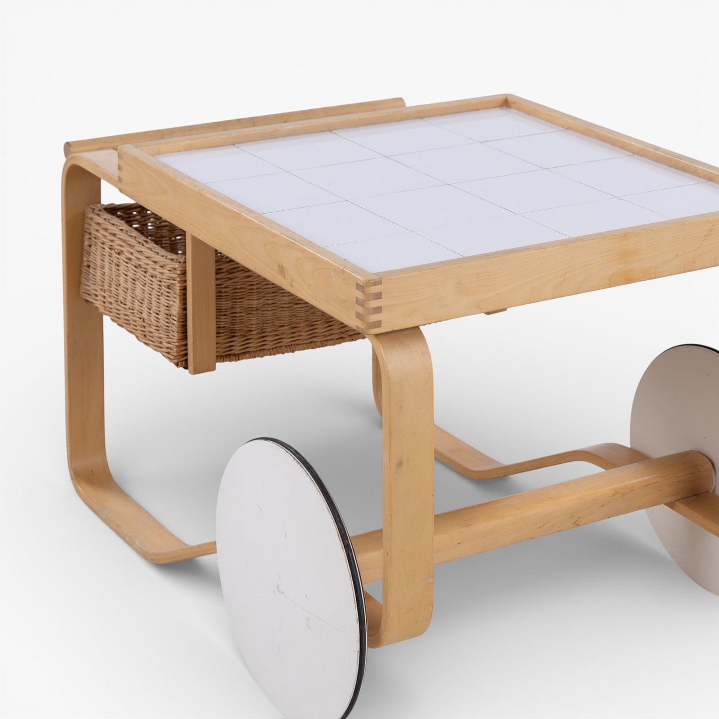 'Tea Trolley 900' - Serving trolley in patinated birch with white tiles.