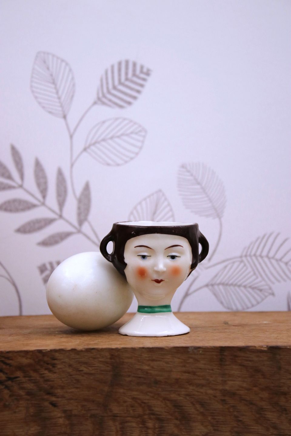 Old egg cup from the 1930s in porcelain with a painted funny face. Height: 6cm.Item number: Æggebægre med ansigt nr.1
