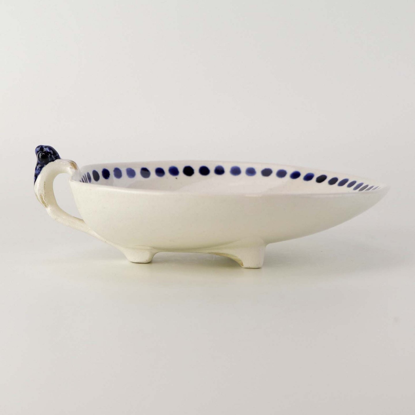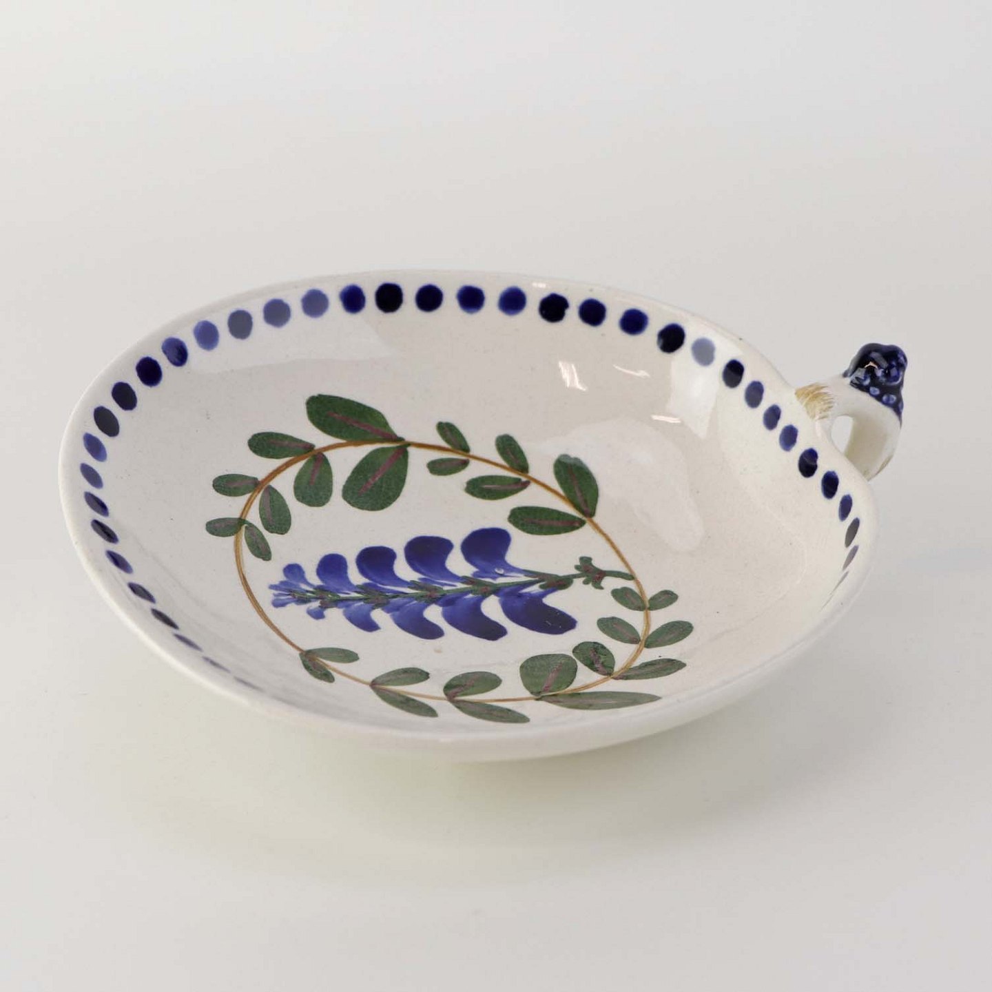 Lille asiet på fod og med hank i fajance fra stellet Blåregn. Stellet er fremstillet i perioden år 1903-1933. Nr. 522/187Formgiver Christian Joachim