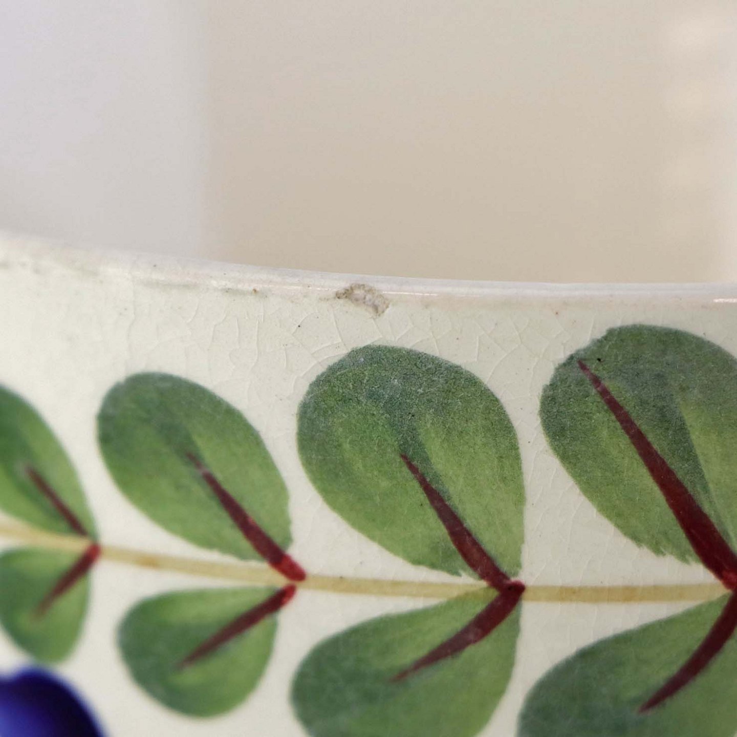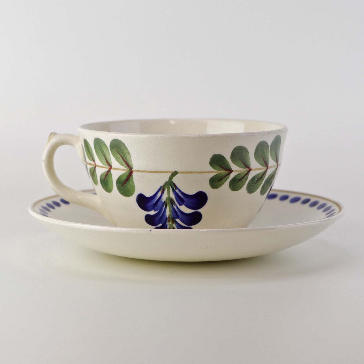 Fajancestel med dekoration af ranker af blåregn og blade på lys baggrund afsluttet med kant af runde blå pletter.