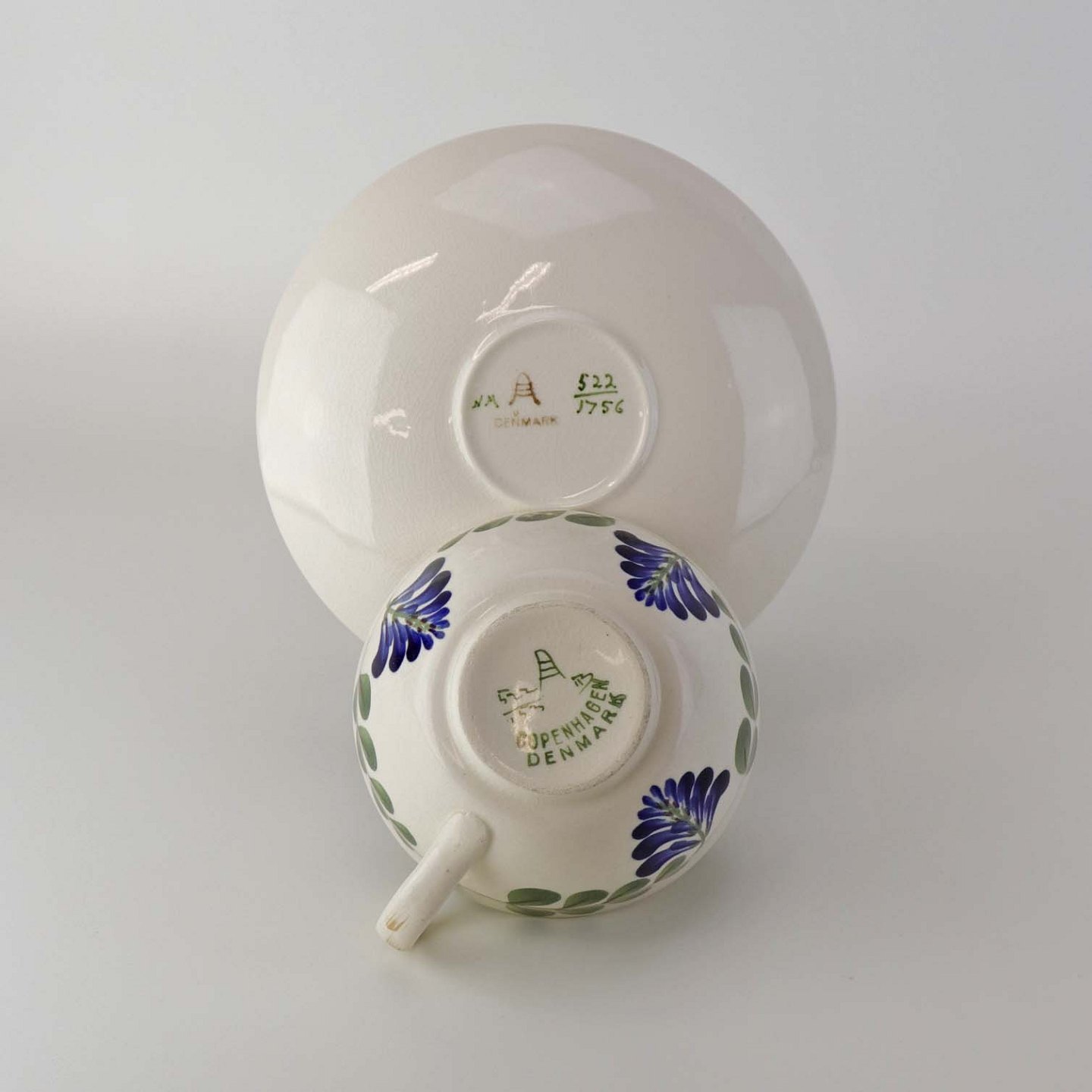 Tekop med underkop i fajance fra stellet Blåregn. Stellet er fremstillet i perioden år 1903-1933. Nr. 522/1756Formgiver Christian Joachim