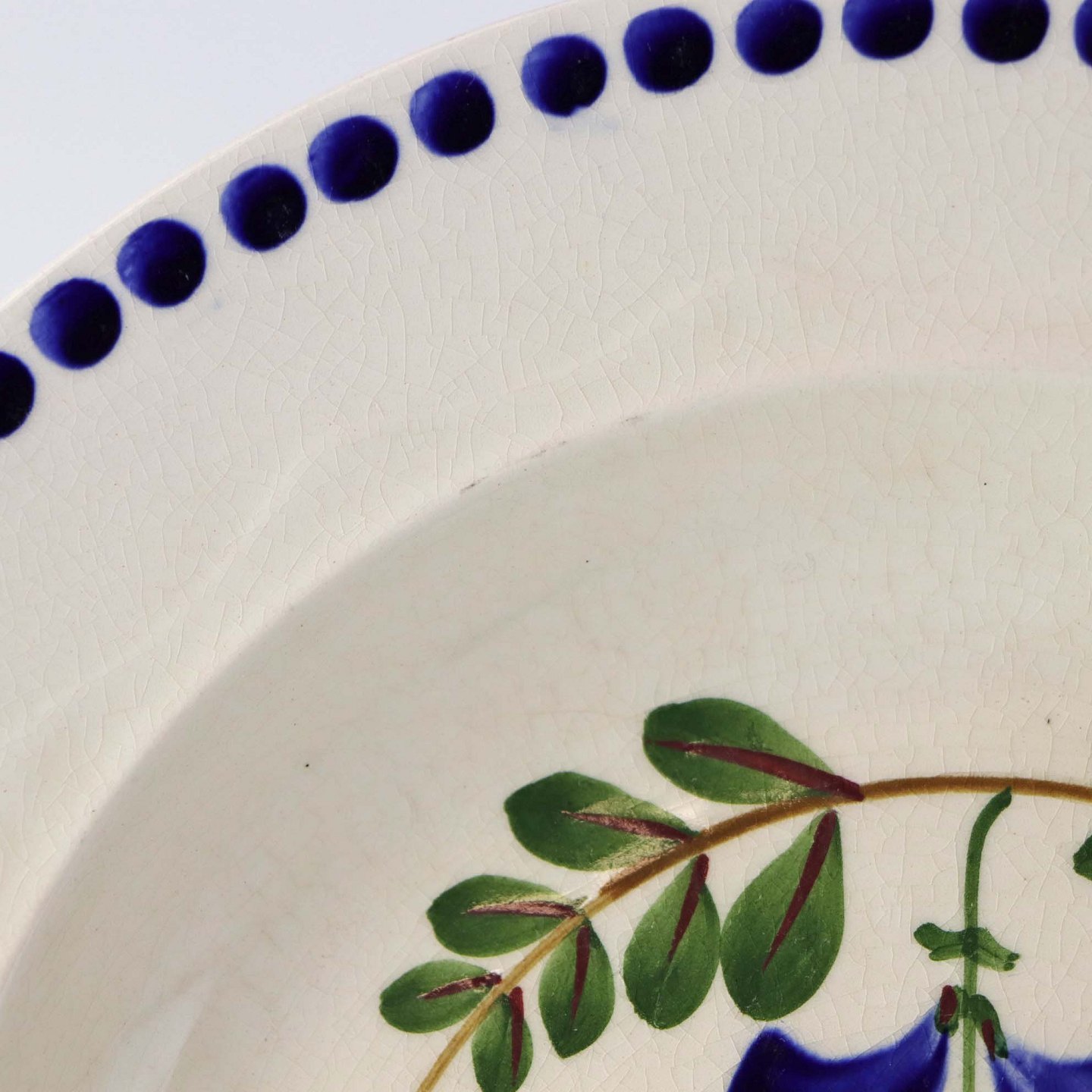 Fajancestel med dekoration af ranker af blåregn og blade på lys baggrund afsluttet med kant af runde blå pletter.