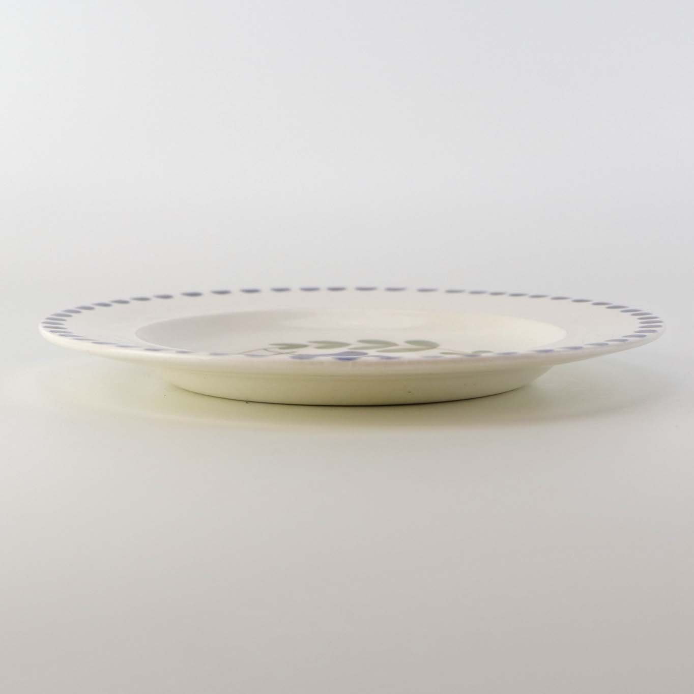 Fajancestel med dekoration af ranker af blåregn og blade på lys baggrund afsluttet med kant af runde blå pletter.