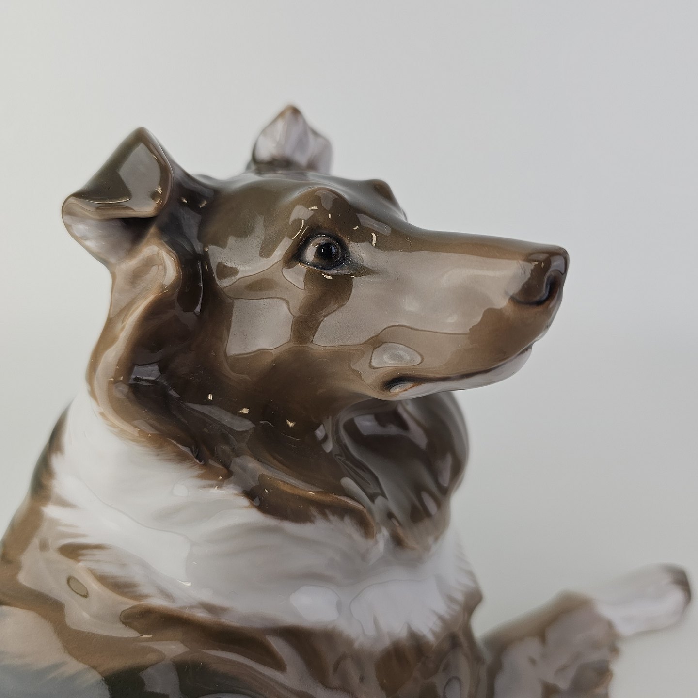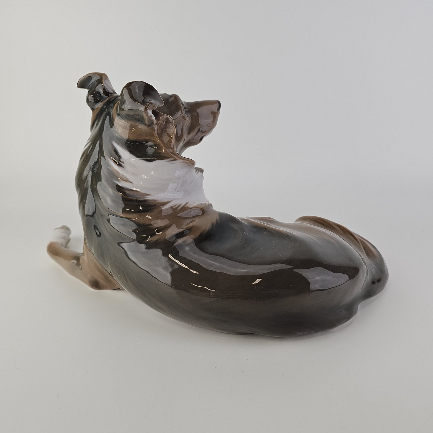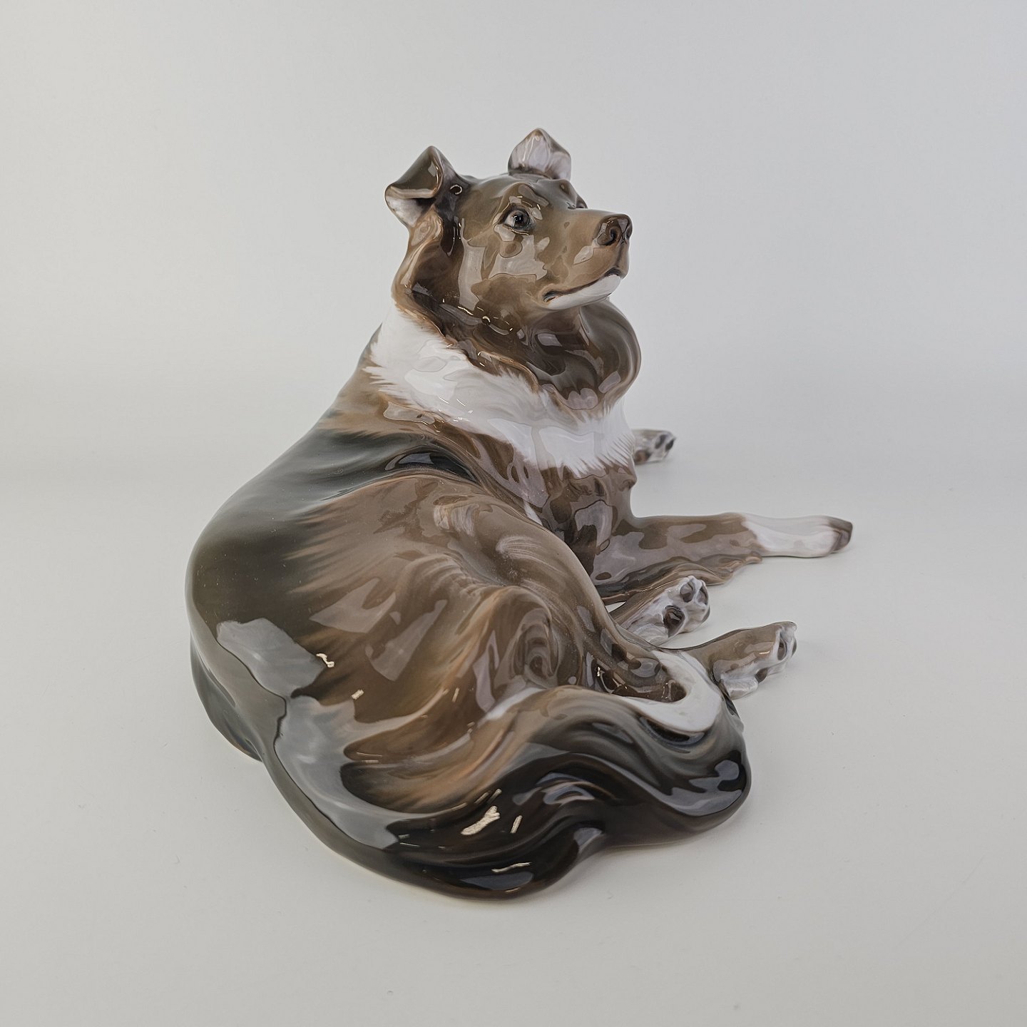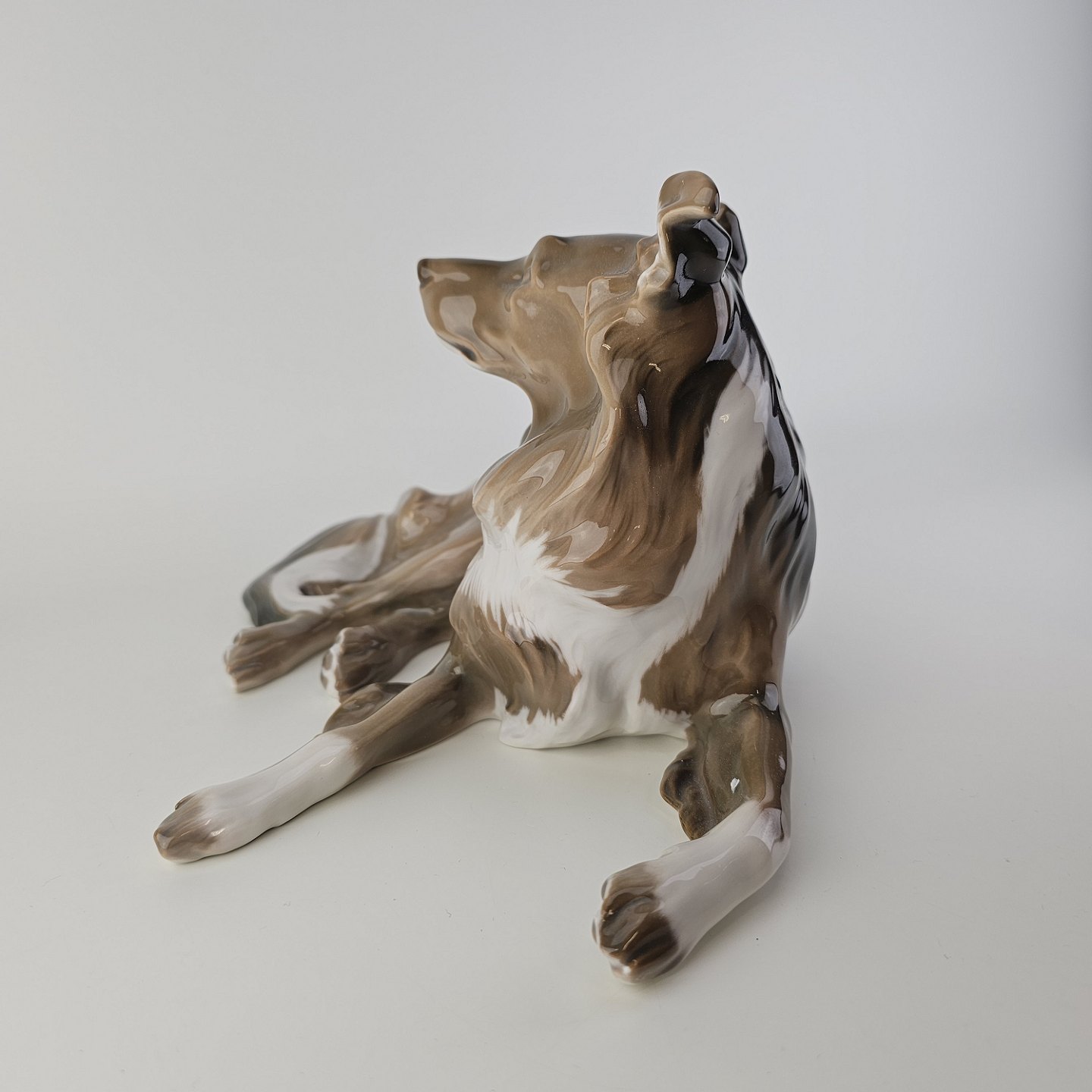 Figur i hvidt porcelæn med motiv af en liggende hund. Nr. 1663