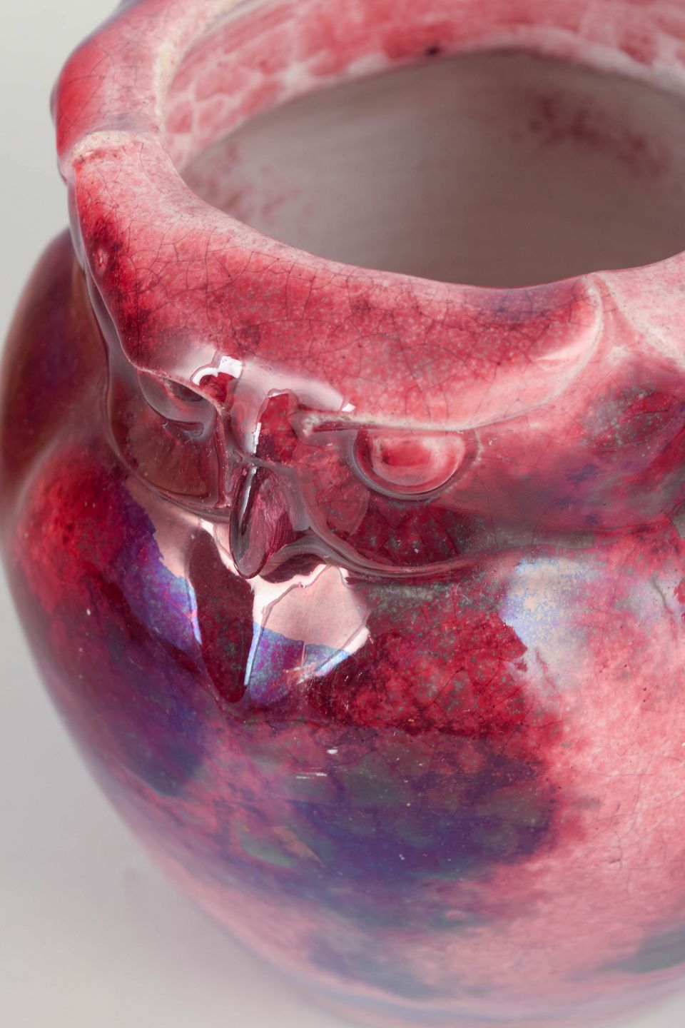Unique art pottery owl vase with sculptural owl decoration along the rim and iridescent glaze in red and blue tones. Produced at Kähler in the 1890s during Karl Hansen Reistrup’s tenure as artistic director from 1888.