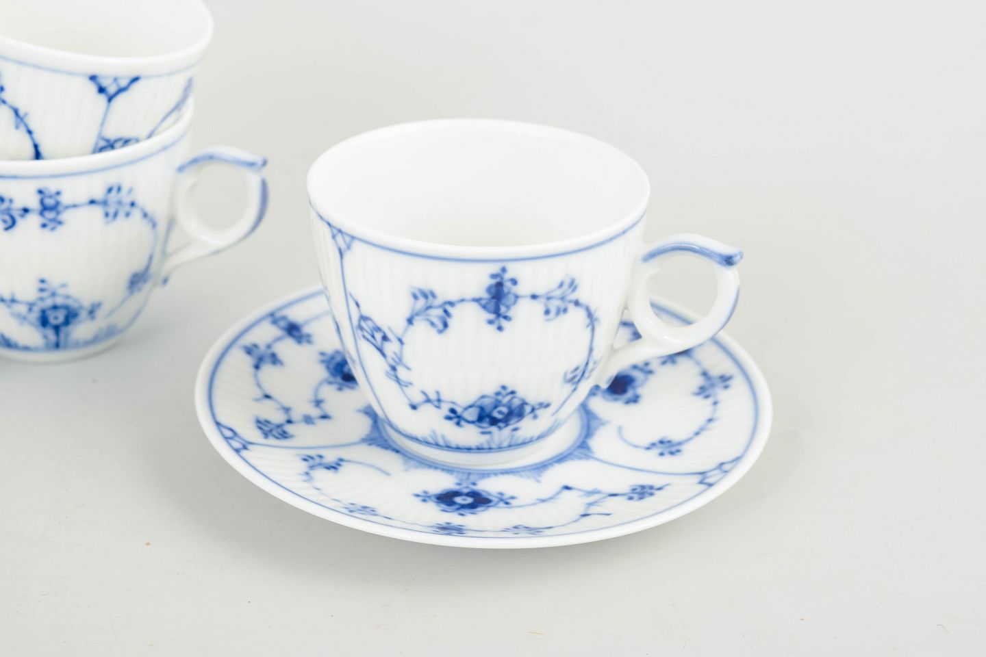 Set of four demitasse cups with matching saucers in hand-painted porcelain from Blue Fluted Plain with classic underglaze decoration in cobalt blue. Model 1/298.