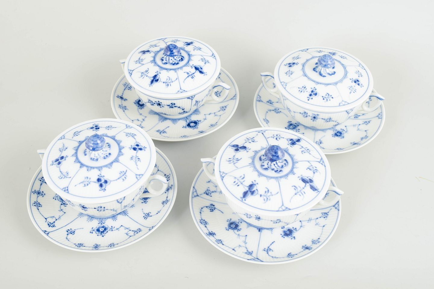 Royal Copenhagen Blue Fluted Plain, set of four bouillon cups with matching saucers.Set of four bouillon cups with matching saucers in hand-painted porcelain from Blue Fluted Plain with classic underglaze decoration in cobalt blue. Model 1/2199. Some pieces are first factory quality, others are cancelled with one incised line on the base.
