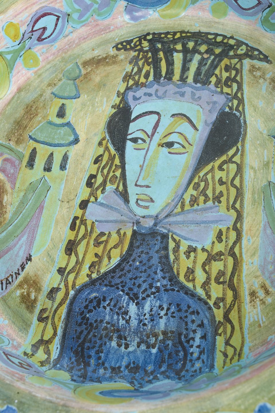 Birger Kaipiainen for Arabia, large unique bowl.Large hand-decorated ceramic bowl with scalloped rim and polychrome decoration depicting a stylised female figure surrounded by ornamental motifs.