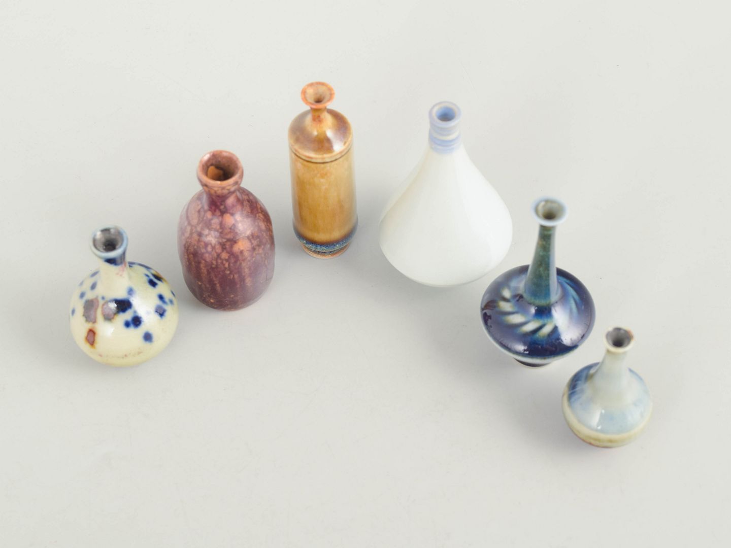 Set of six miniature ceramic vases.Collection of six miniature ceramic vases in varied forms and glazes. Made in ceramic with multicoloured glazes in blue, brown and light tones. All examples are marked on the base. Examples are from Höganäs and others from various makers.
