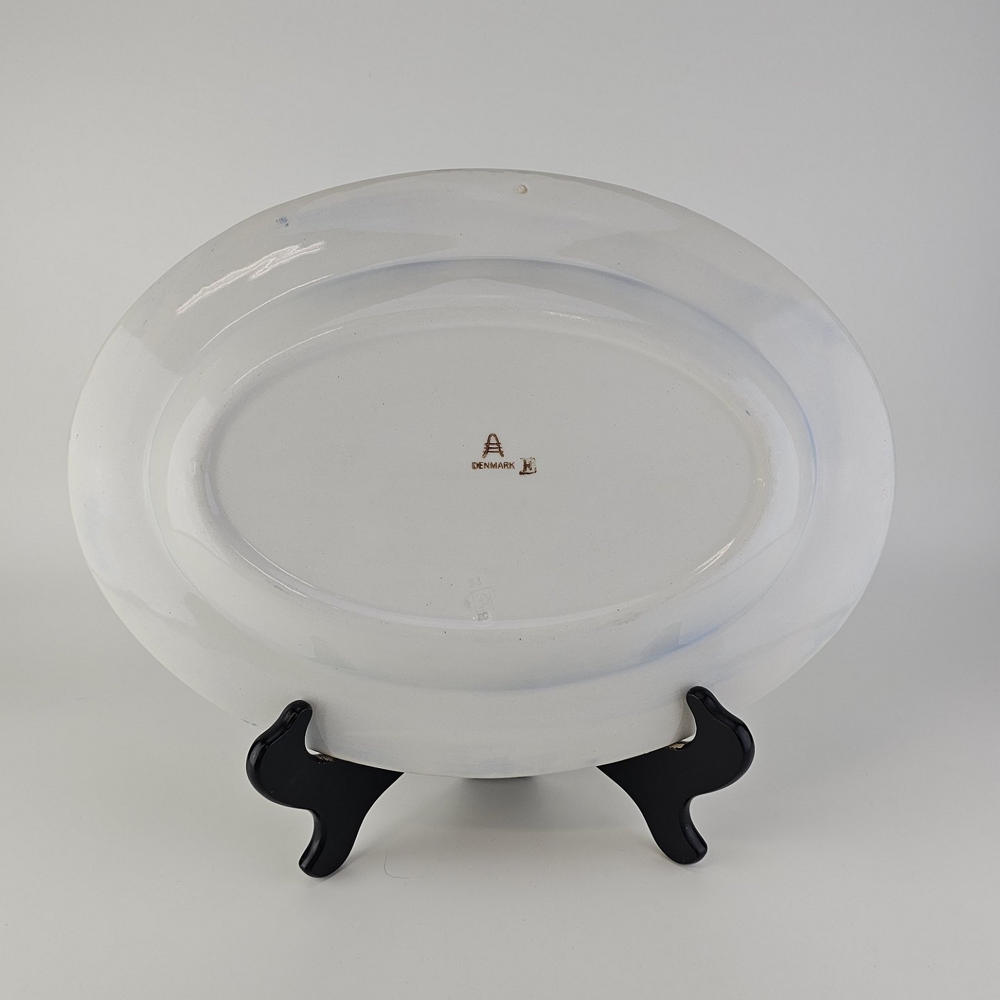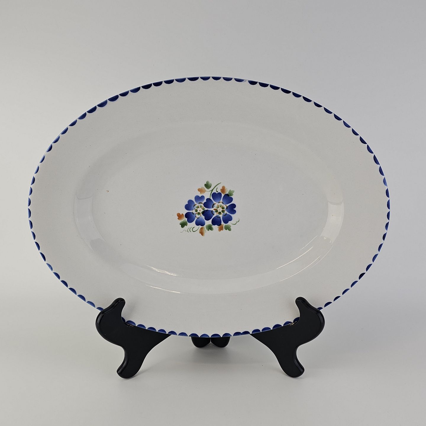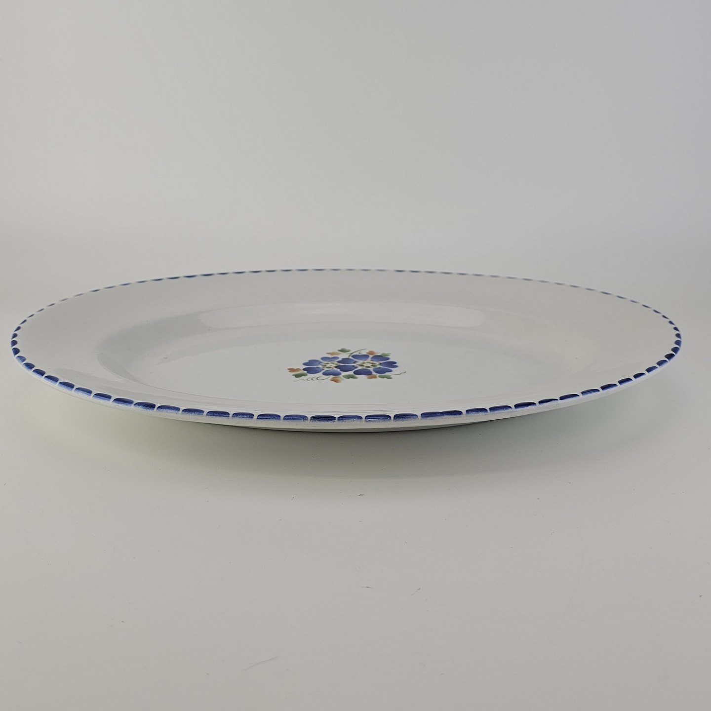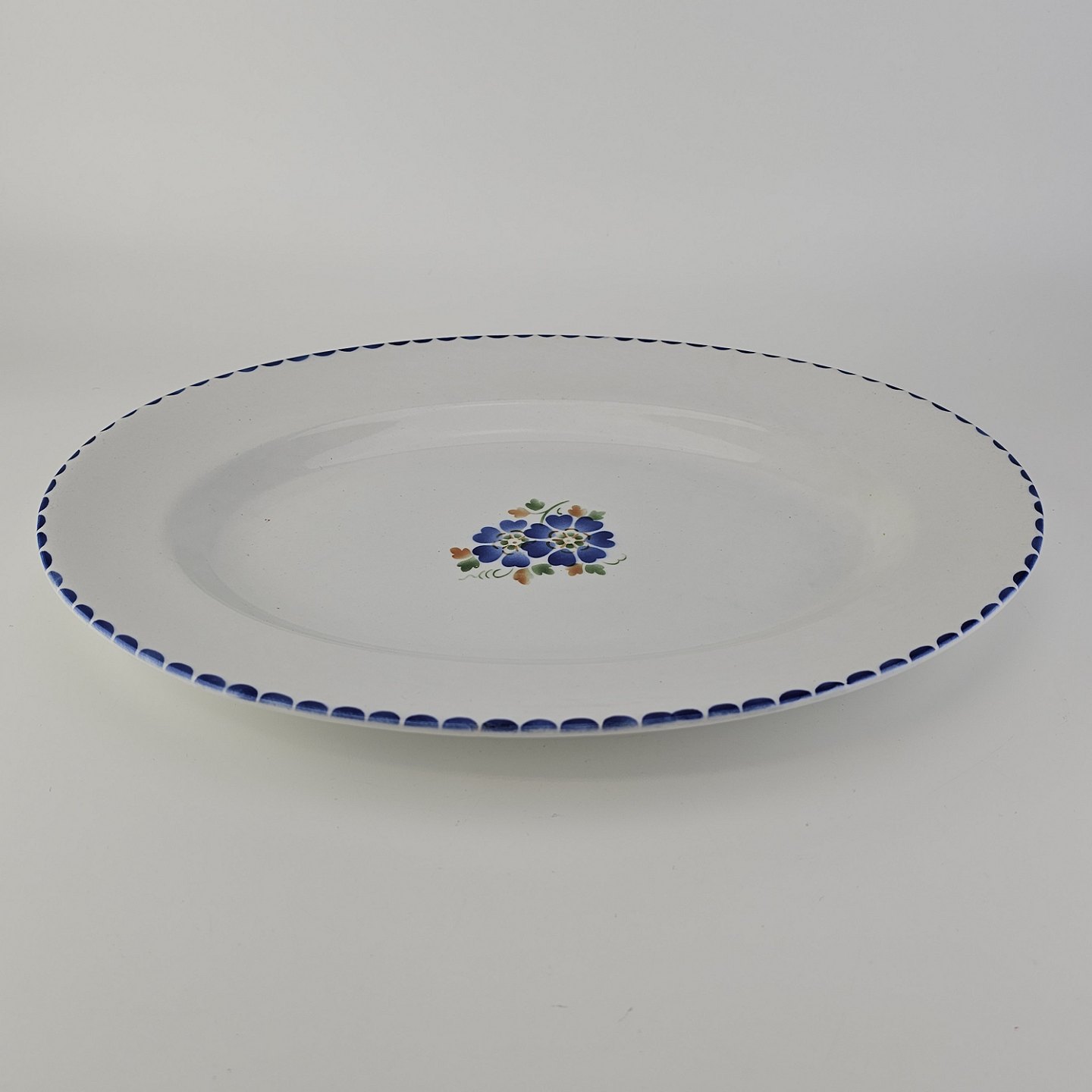 Ovalt fad i fajance fra stellet Geranium II fremstillet i perioden 1927-1940.Formgiver Nils Thorsson