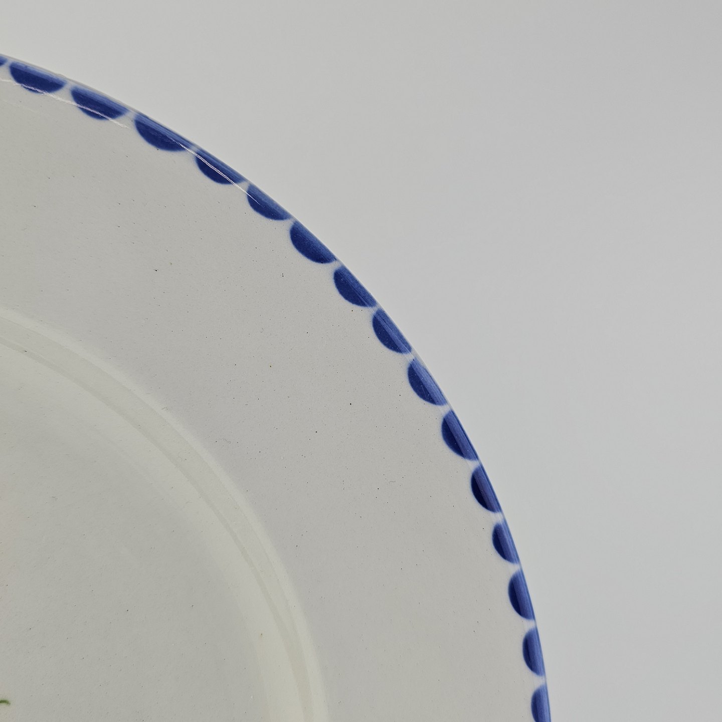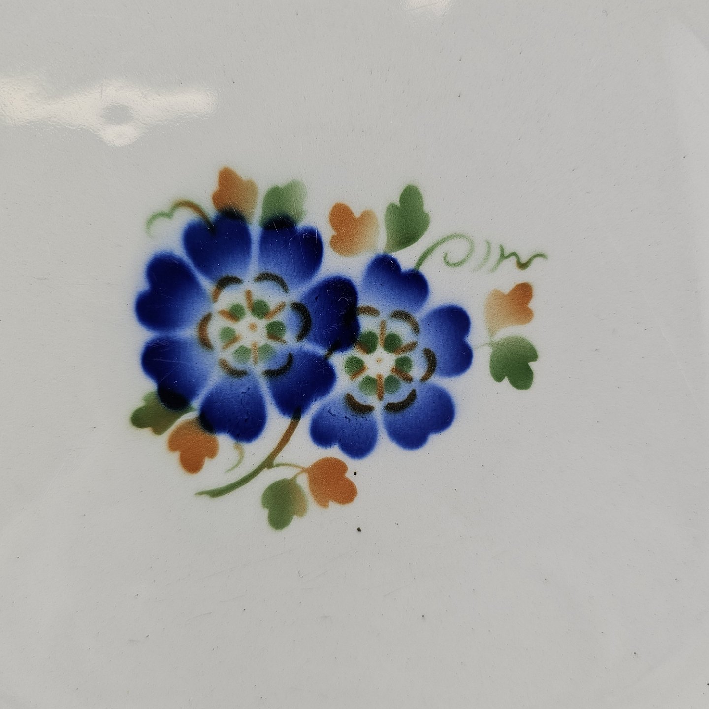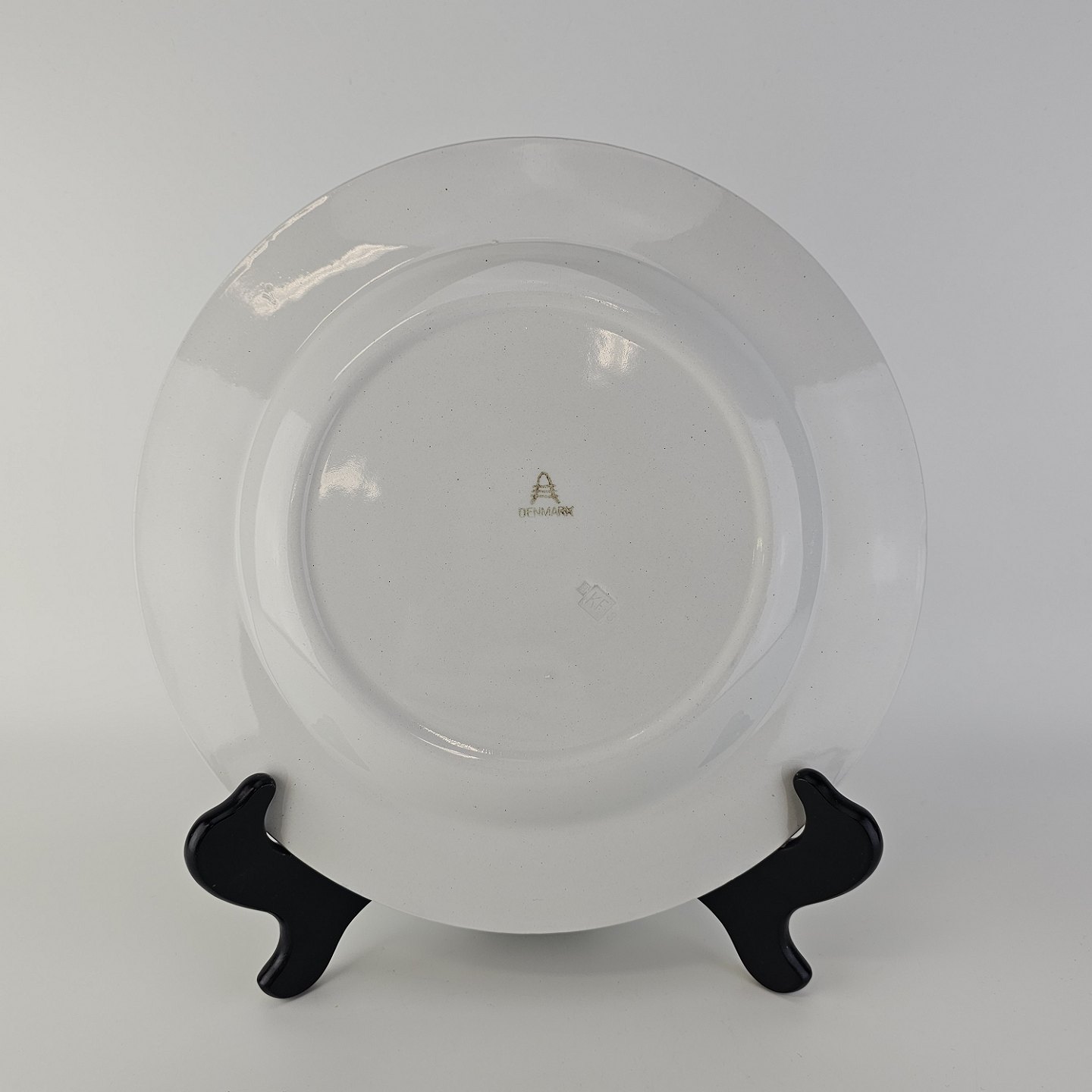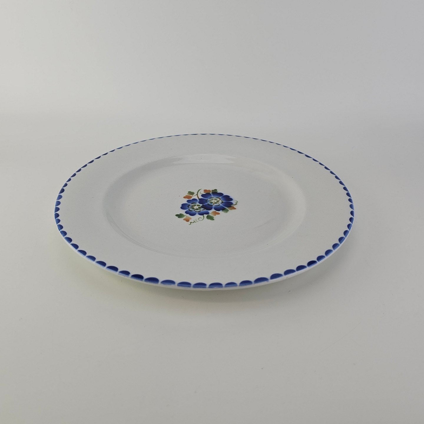 Flad middagstallerken i fajance fra stellet Geranium II fremstillet i perioden 1927-1940.Formgiver Nils Thorsson