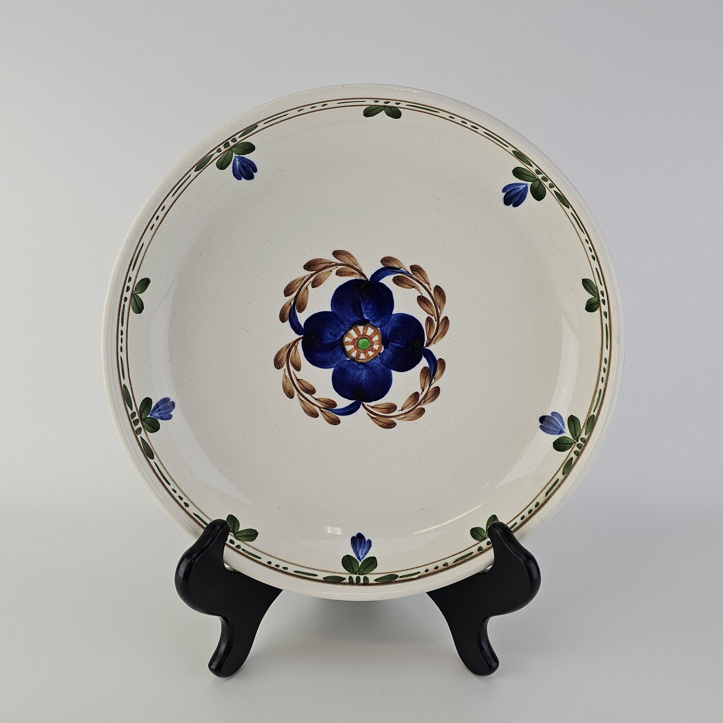 Rundt fad i kunstfajance med dekoration af blå blomster