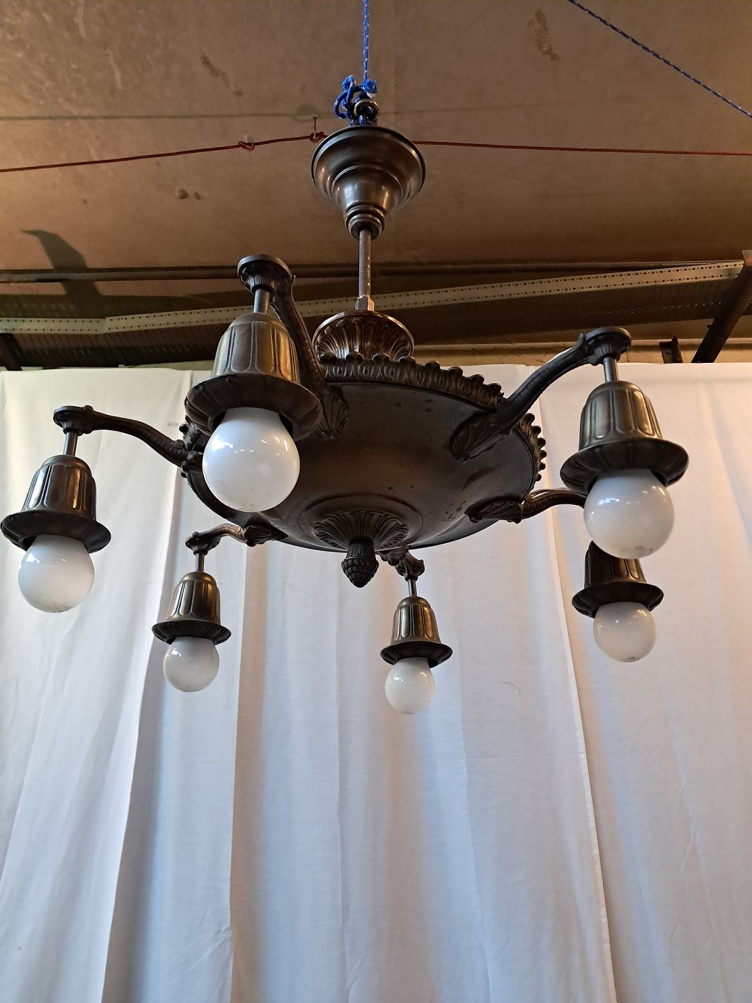 Lysekrone i bruneret messing, fra 1930erne.Den har brugsspor.