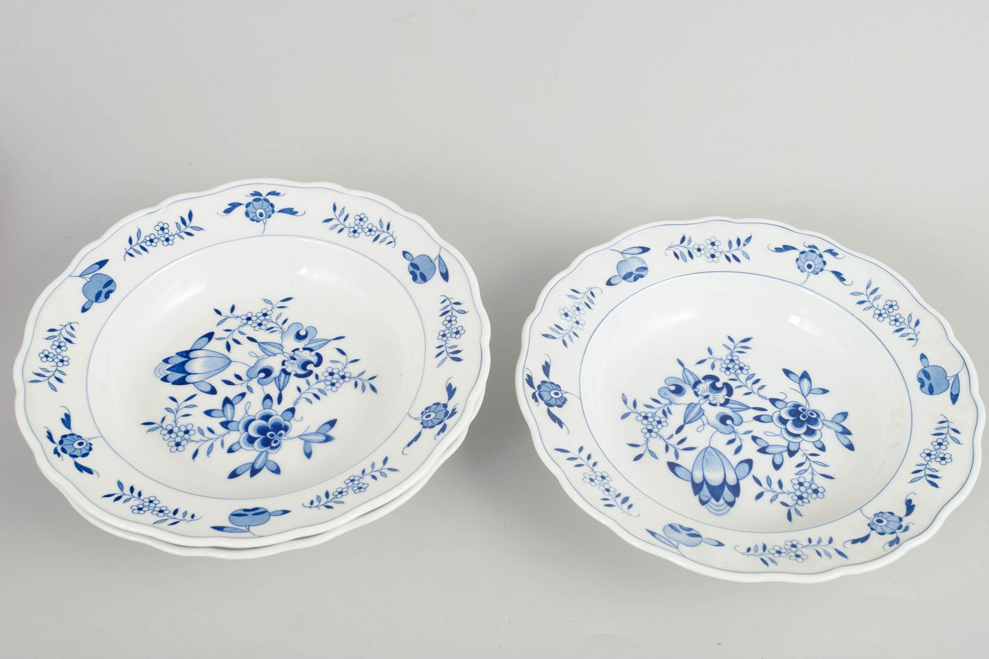 Meissen Blue Orchid, set of three soup plates.Set of three hand-painted porcelain soup plates with Blue Orchid decoration. Produced by Meissen and marked with the Meissen crossed swords. Cancelled with two incised lines on the underside.
