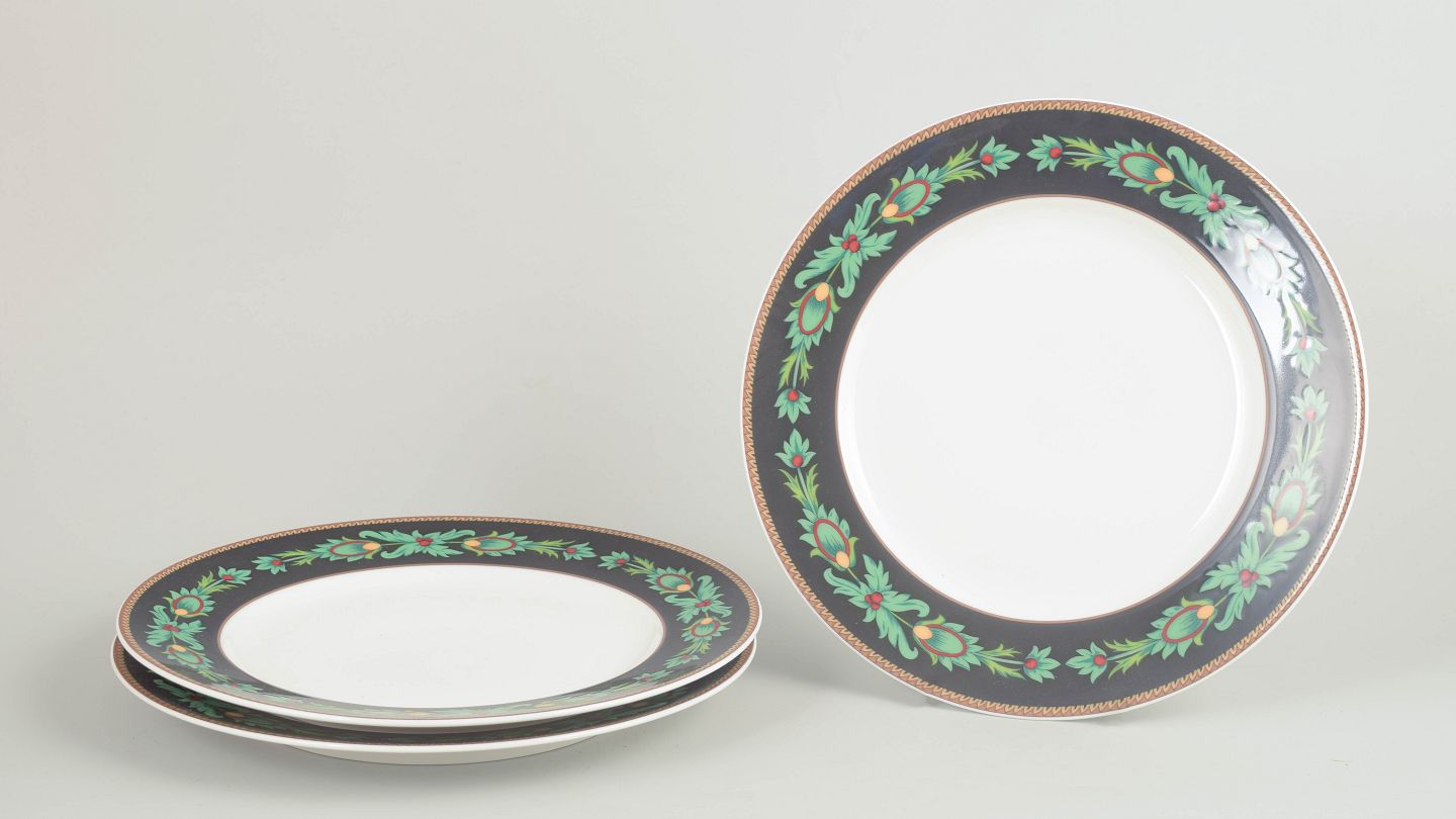Set of three porcelain dinner plates with a decorative border in green and gilt tones against a dark ground. The plates were produced by Rosenthal after a design by Nina Campbell. Each plate measures 26 cm in diameter.