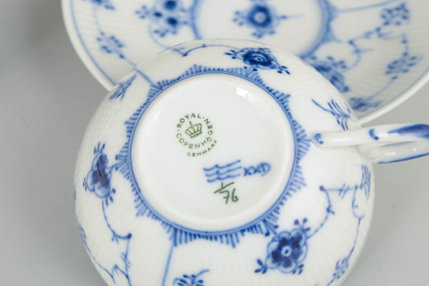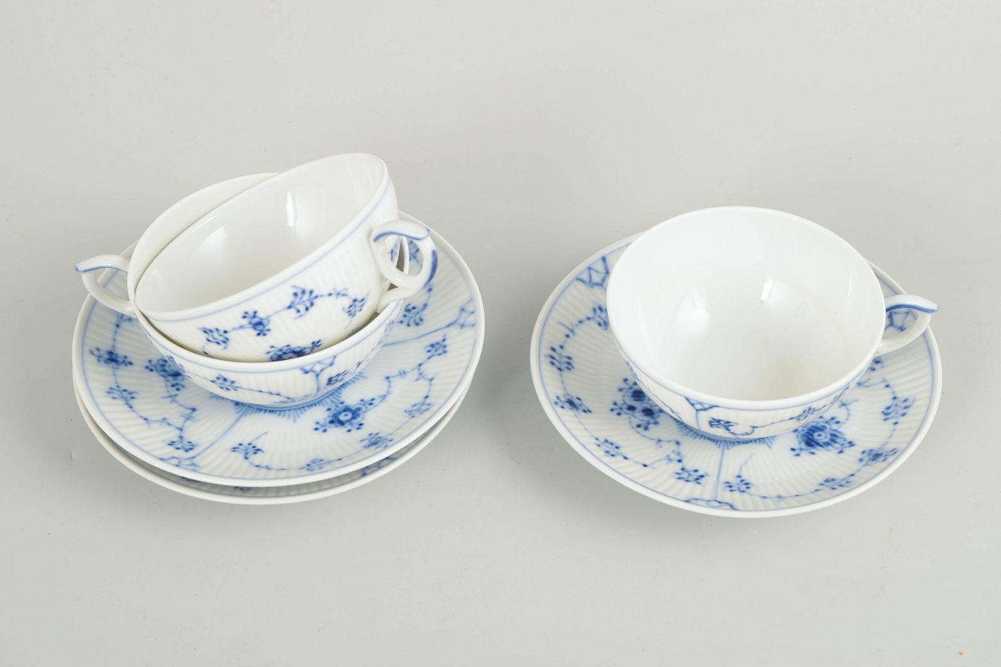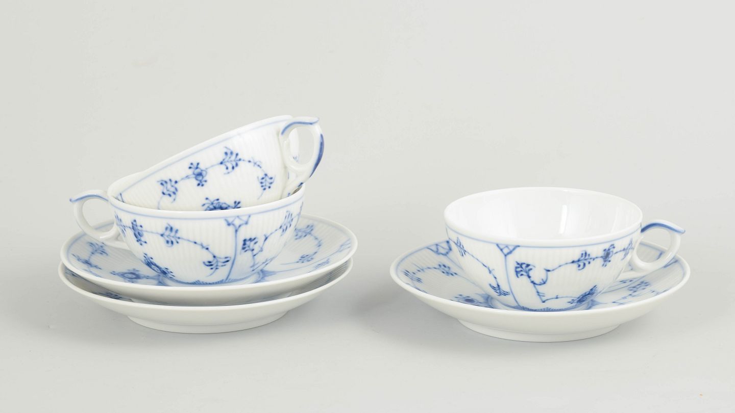 Royal Copenhagen Blue Fluted Plain set of three tea cups with matching saucers.Set of three tea cups with matching saucers in hand-painted porcelain from the Blue Fluted Plain service with classic underglaze cobalt blue decoration and fluted surfaces. Model 1/76. Cups H. 5 cm, D. 12 cm. Saucers D. 15 cm. First factory quality. Produced in the 1960/80s.
