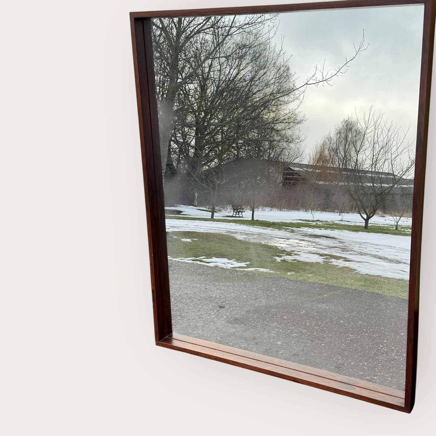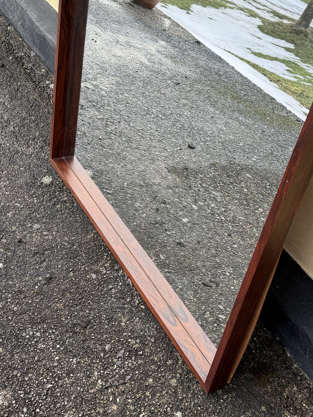 Large rosewood mirror with a strong frame. Has been in the hallway set together with the sideboard item no. 632824, Discontinued and marked from Illums Bolighus, Dimensions: 100x123cm *Excellent condition*Stock: 1