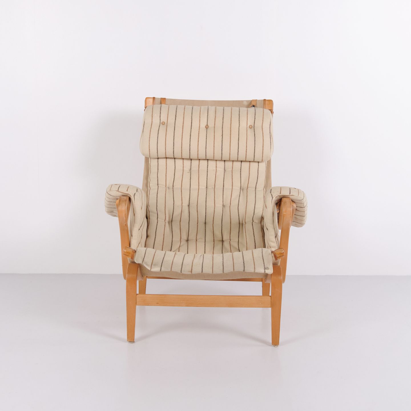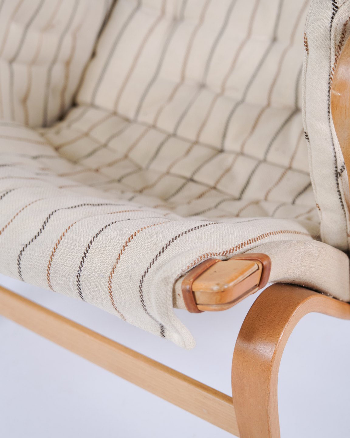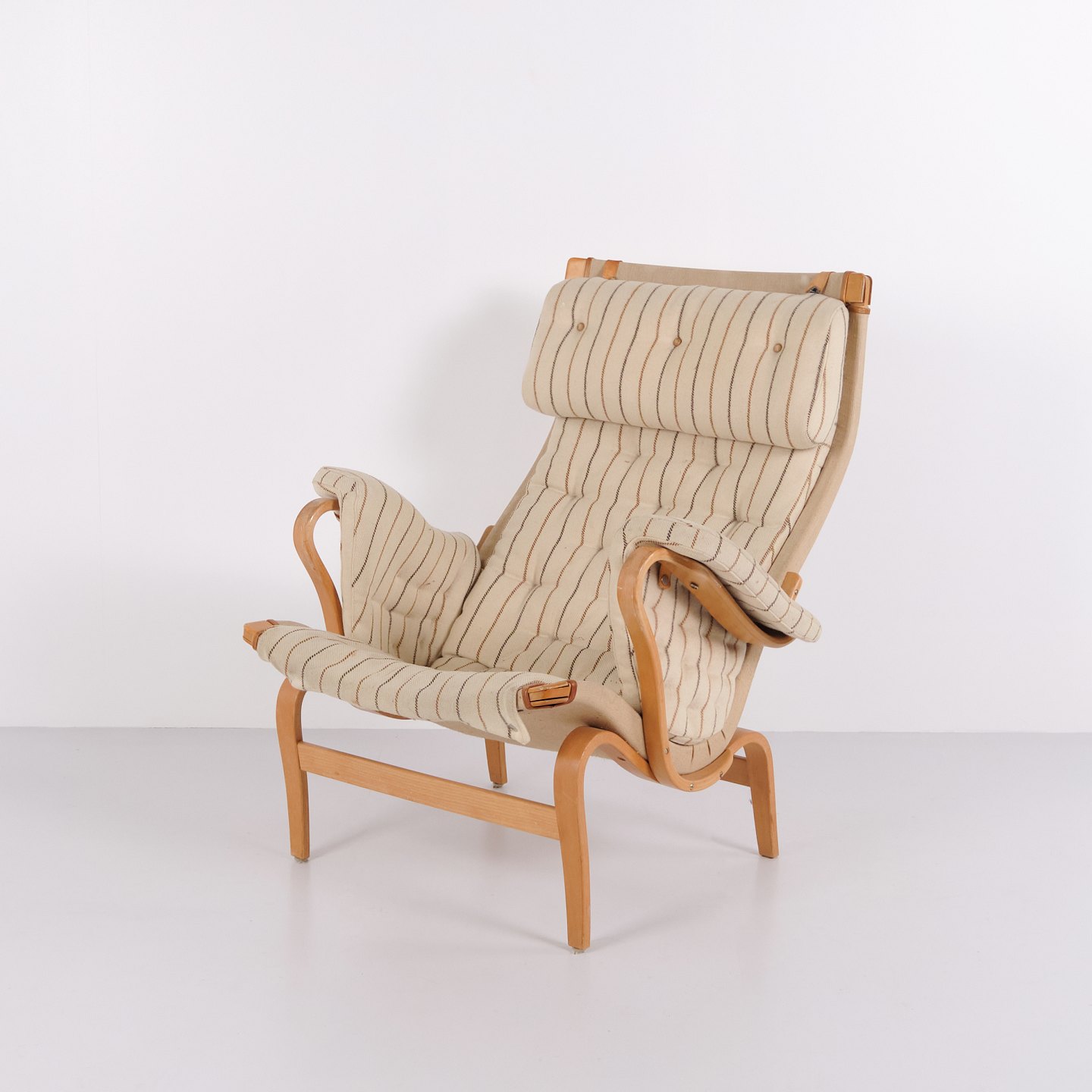 Bruno Mathsson Pernilla armchair model 69 from DUX in striped fabric and beech wood. Classic Scandinavian design from the 1960s.— Origin: Sweden