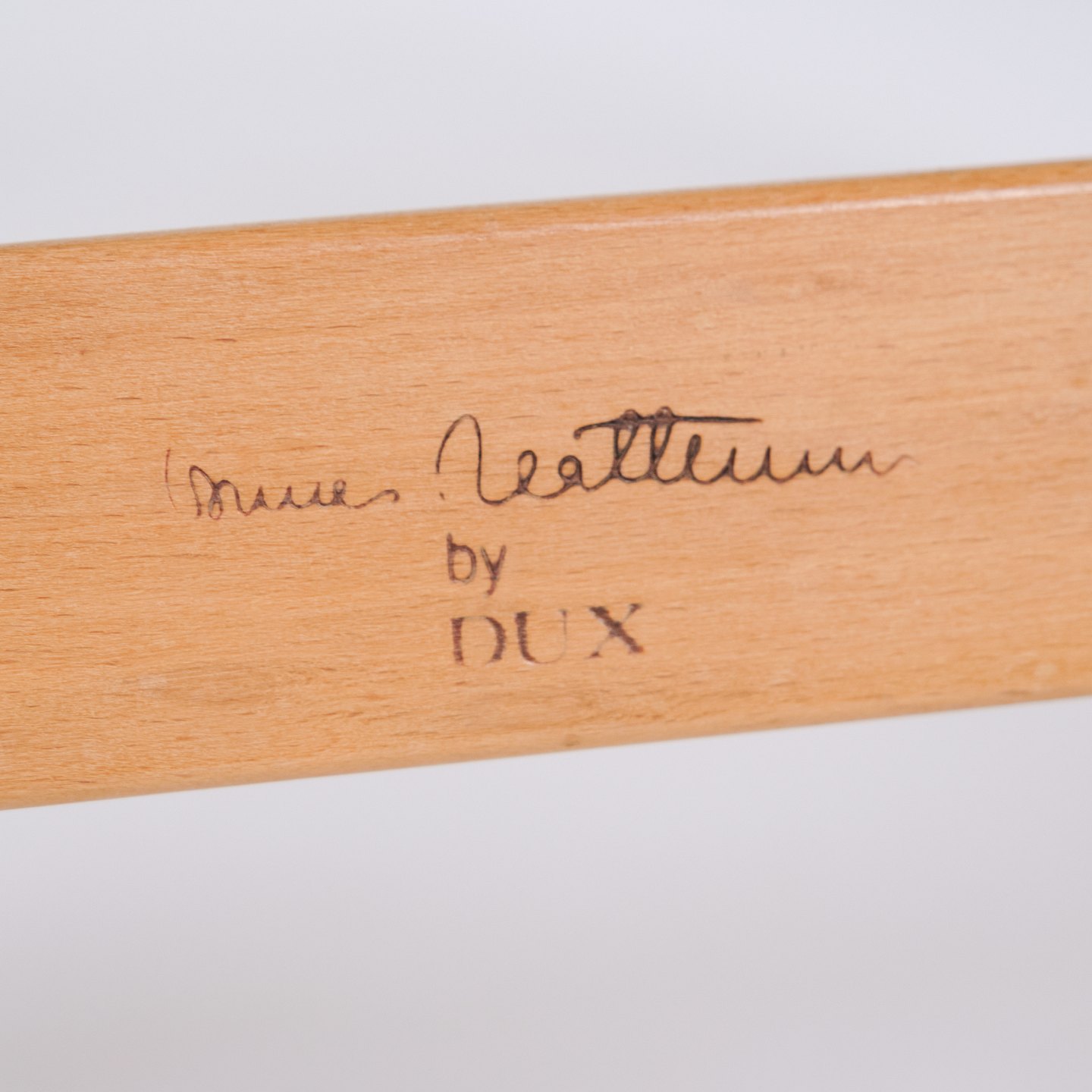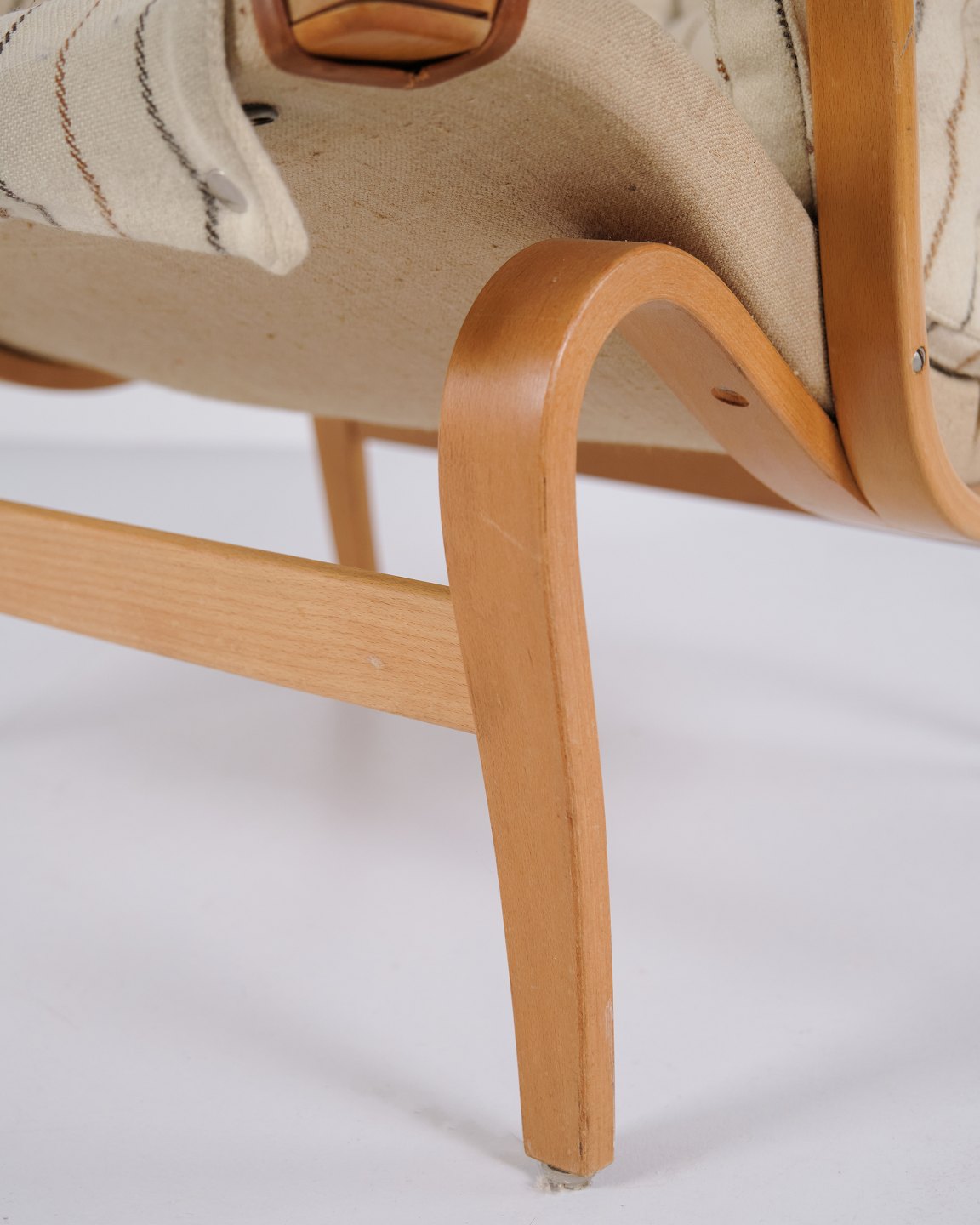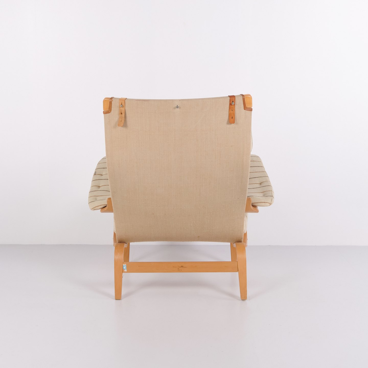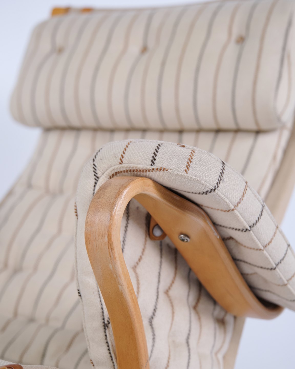 Bruno Mathsson Pernilla armchair model 69 from DUX in striped fabric and beech wood. Classic Scandinavian design from the 1960s.— Origin: Sweden