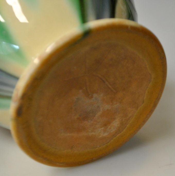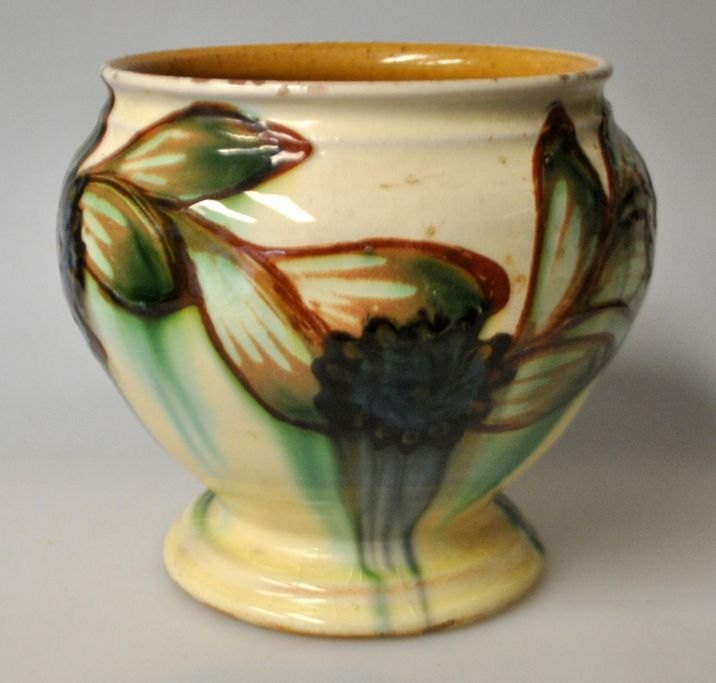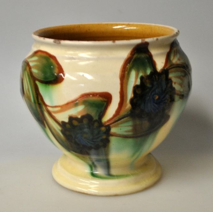 H.A Kähler flower pot, 20th century. Næstved, Denmark. Glazed. With green, brown, blue and black glazes. Stamped. 13 cm.NB: With small edge notches!
