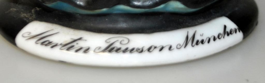 Martin Pauson (1861 - 1934) Germany: Beer stein with "Münchner Kindl", which is a monk. Hand-painted bisque porcelain. Mug with handle and spout of pewter, in the shape of the Frauenkirche. At the bottom lithophane with city motif. Signed: Martin Pauson, Munich. Height.: 22 cm.Perfect condition!